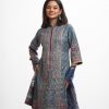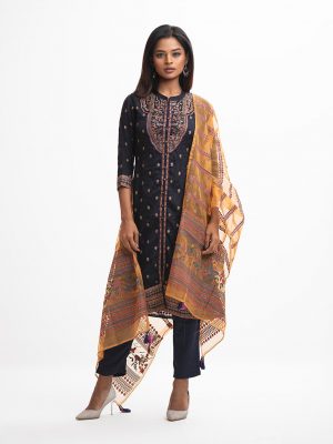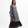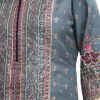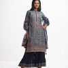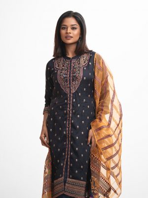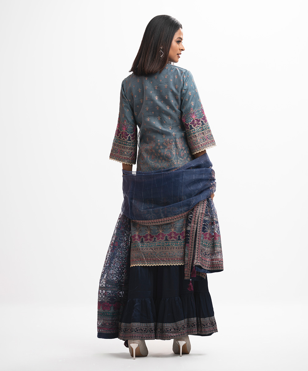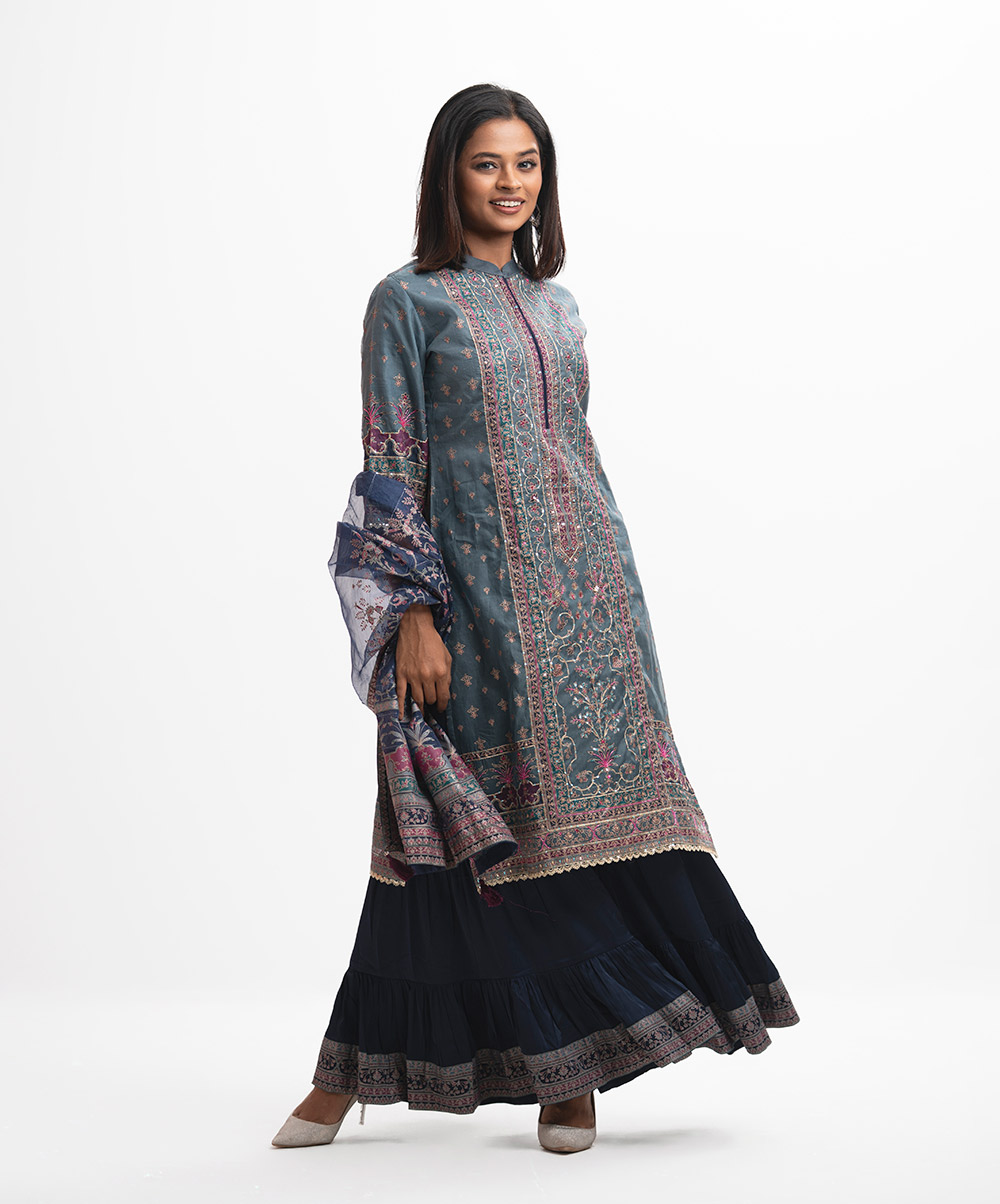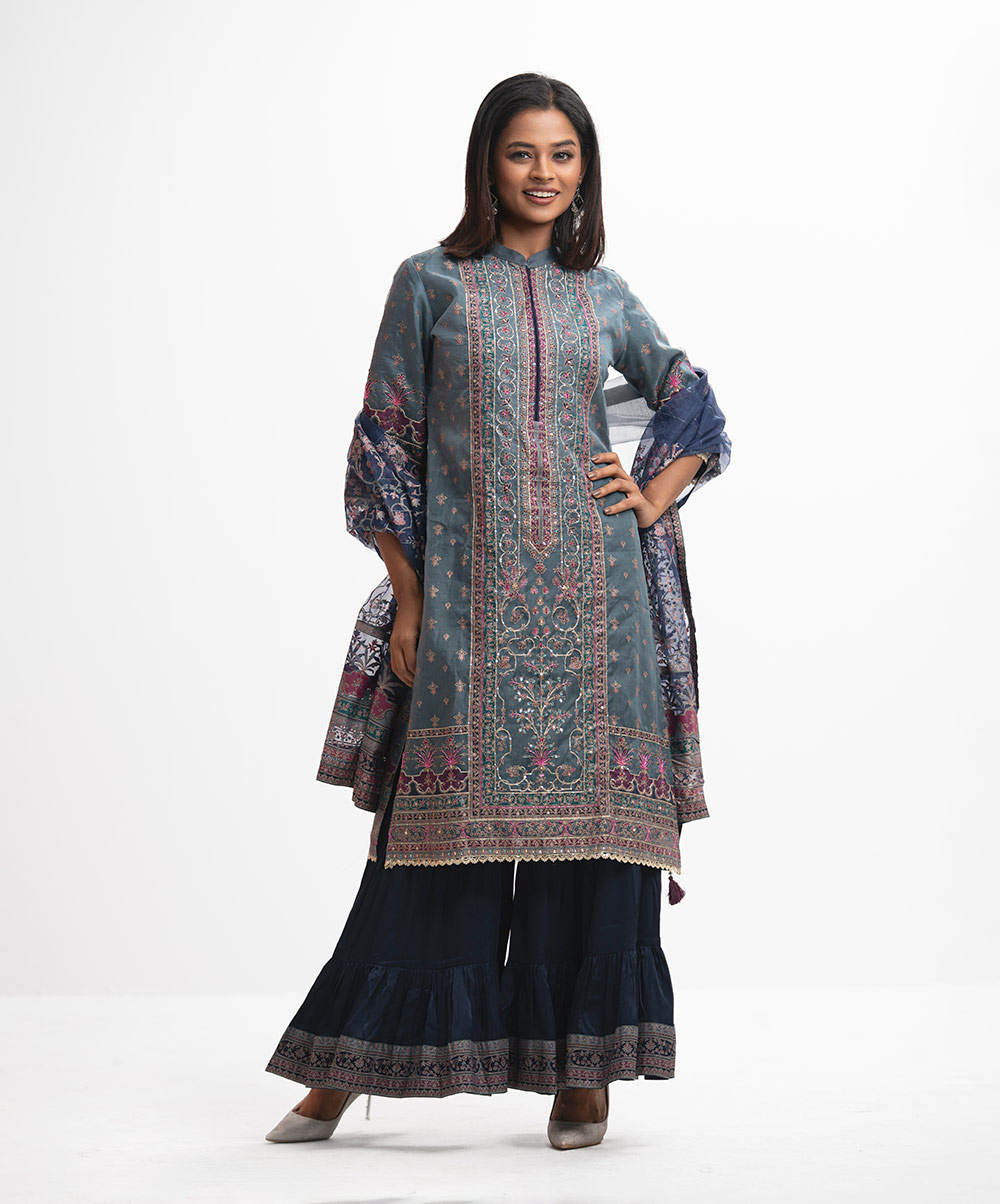 Women’s exclusive sharara salwar kameez in Nargisus by Le Reve. Muslin fabric front part kameez with georgette lining. Mandarin collar, three-quarter sleeves and heavy karchupi detail kameez. With a muslin dupatta & sharara pajama.