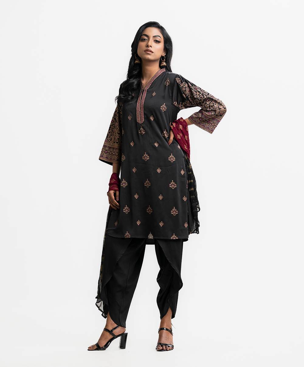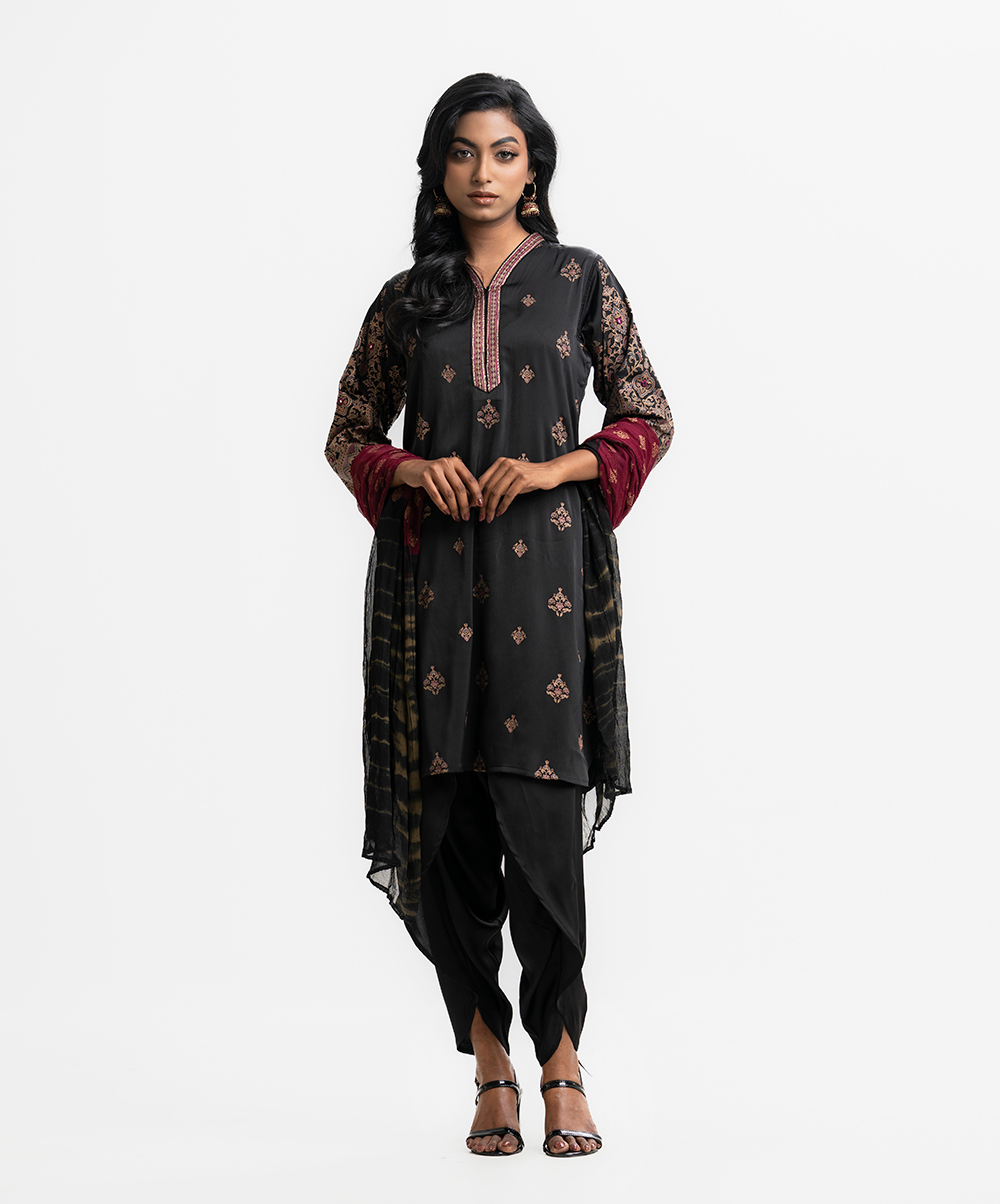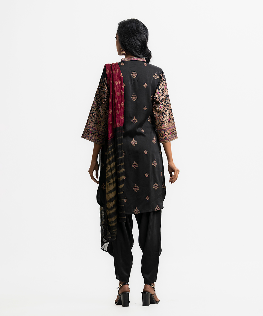 Women’s printed salwar kameez in joom fabric. Embroidery at V-neck and three-quarter sleeves of kameez. Chiffon dyed dupatta with tulip pant pajama.