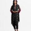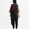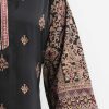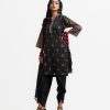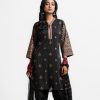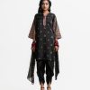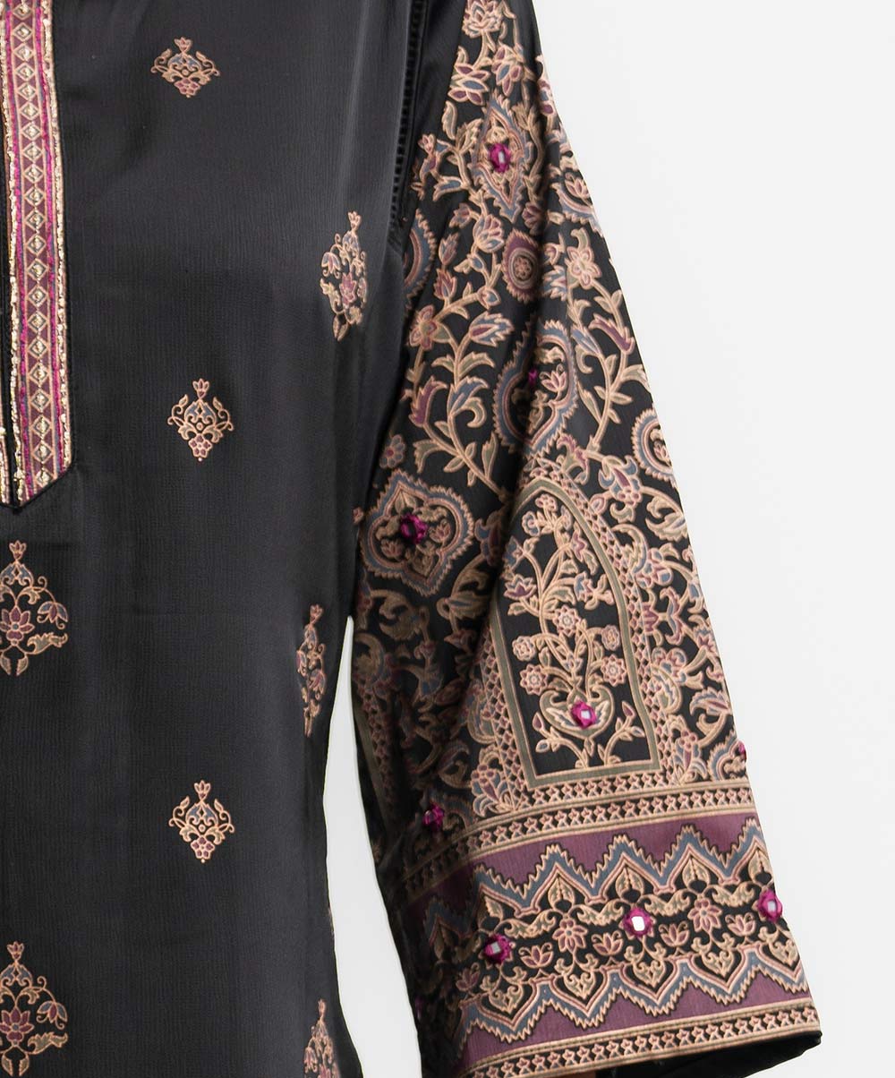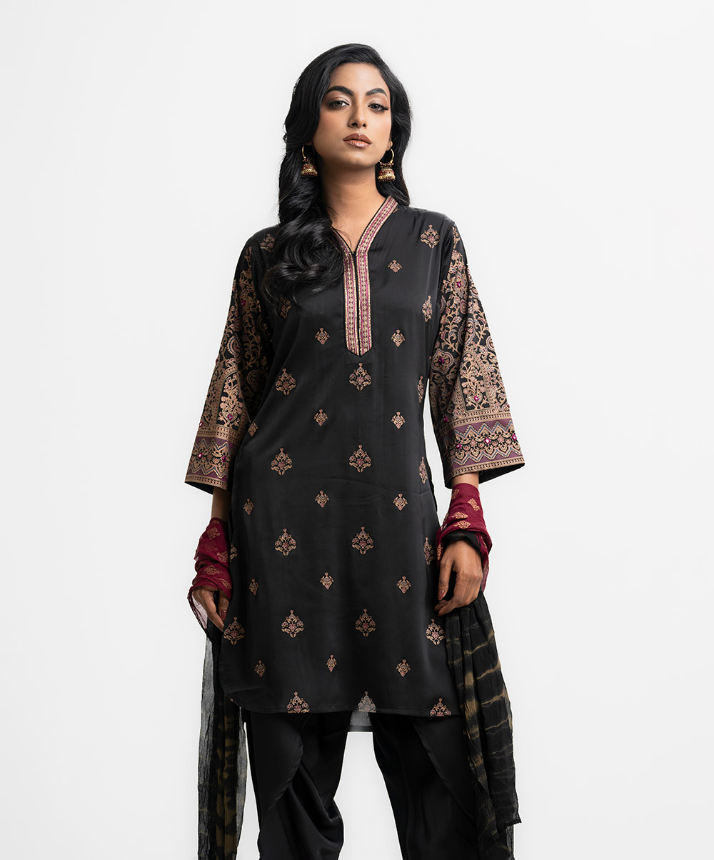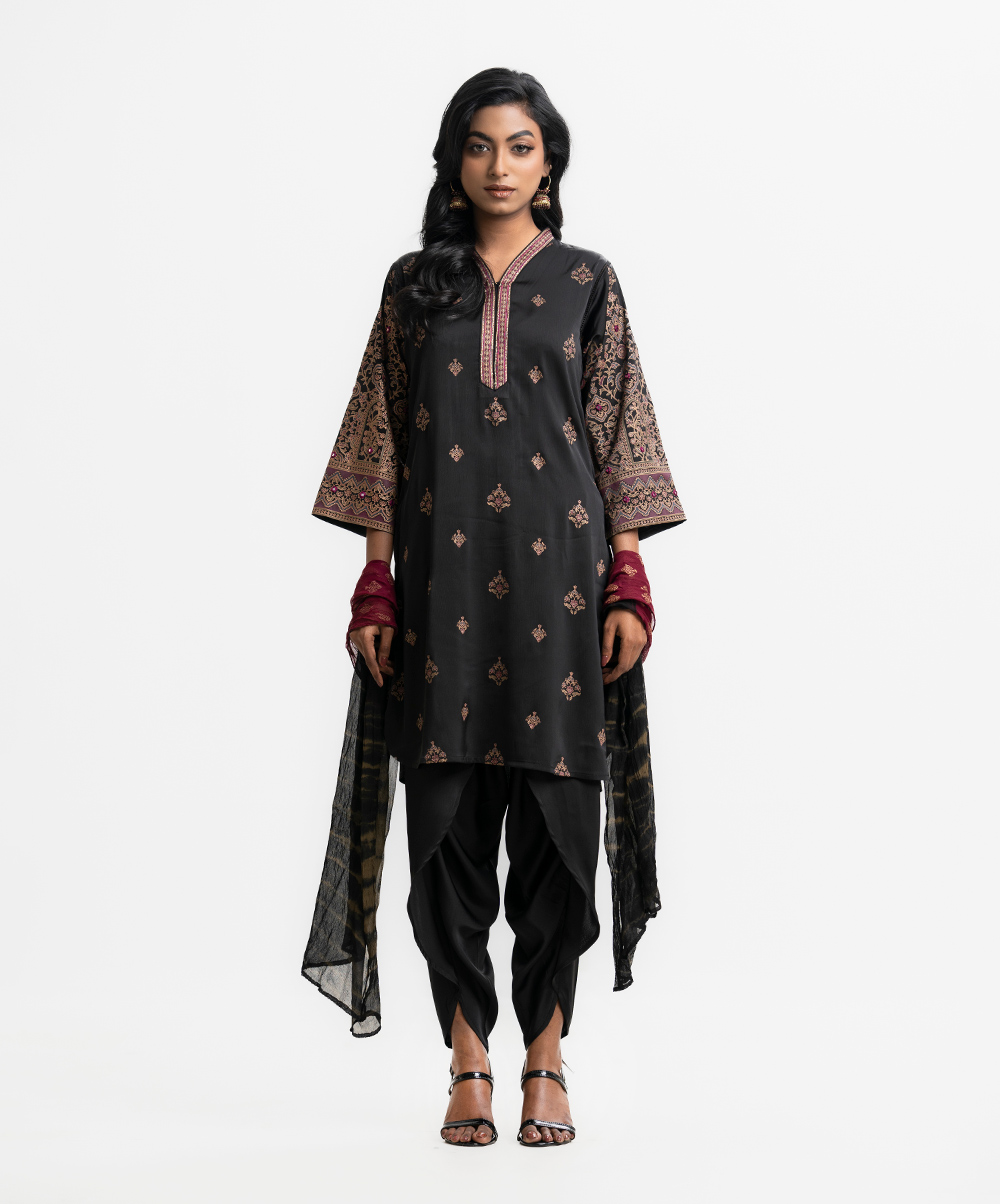 Women’s printed salwar kameez in joom fabric. Embroidery at V-neck and three-quarter sleeves of kameez. Chiffon dyed dupatta with tulip pant pajama.