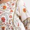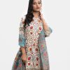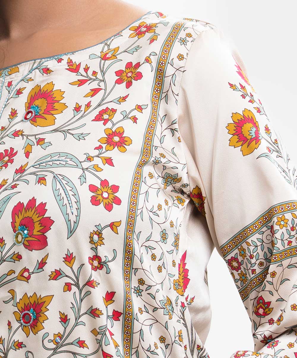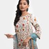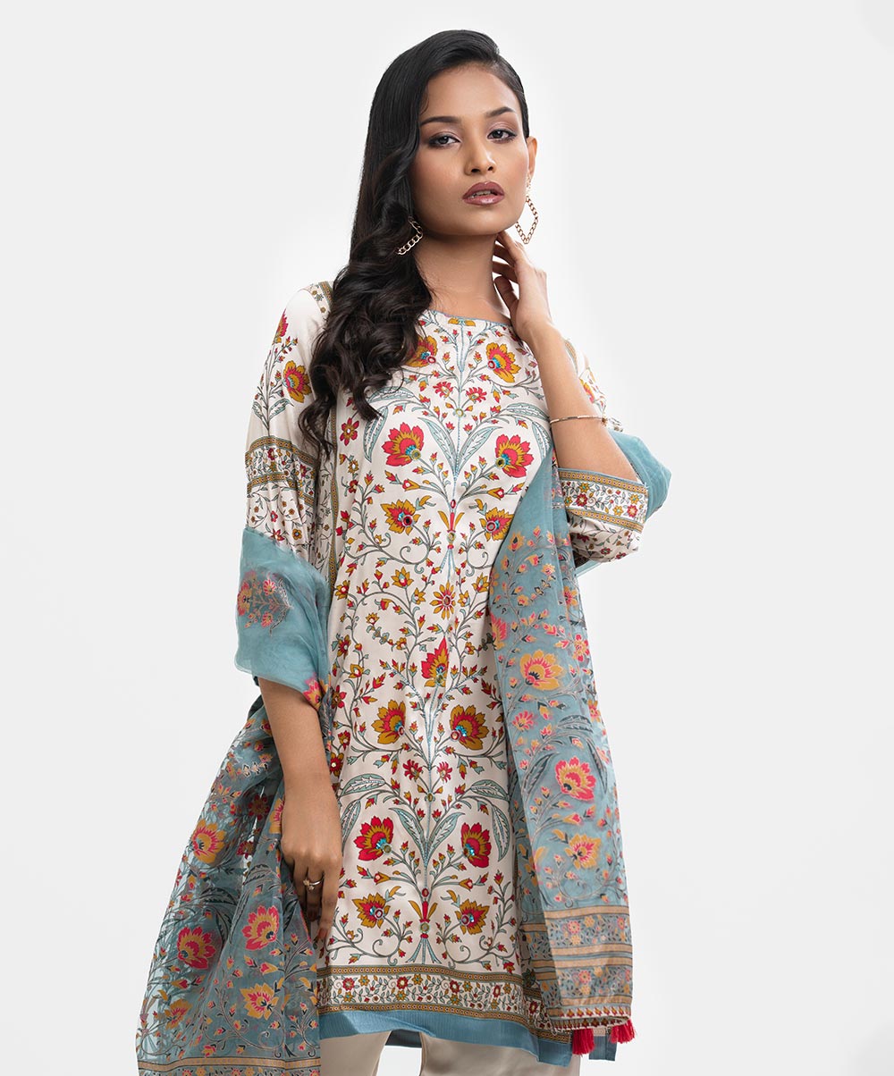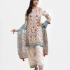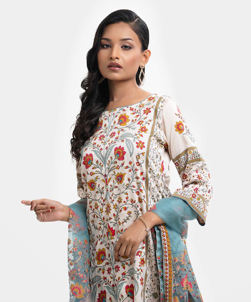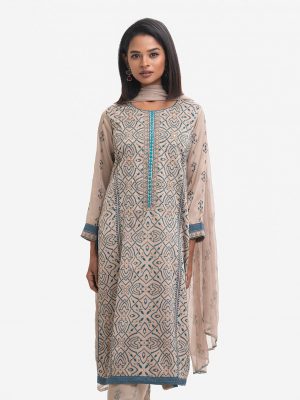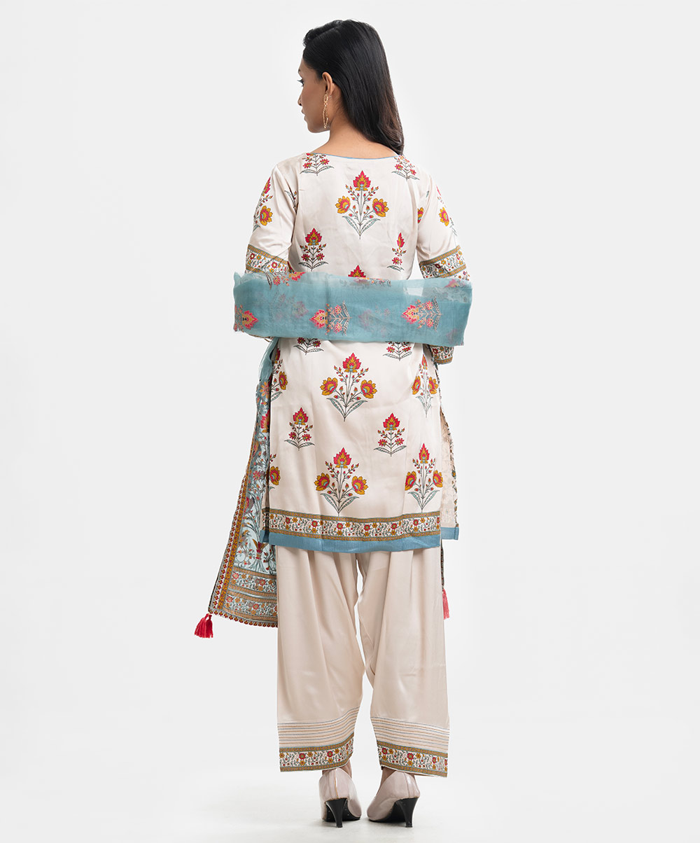 Women’s printed farshi salwar kameez in blended fabric. Boat neck, three-quarter sleeves, heavy karchupi at the front of kameez. Muslin dupatta with farshi-style pajama.