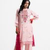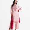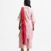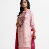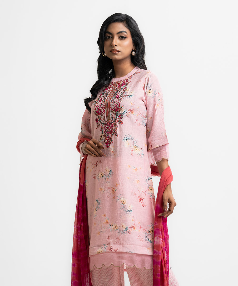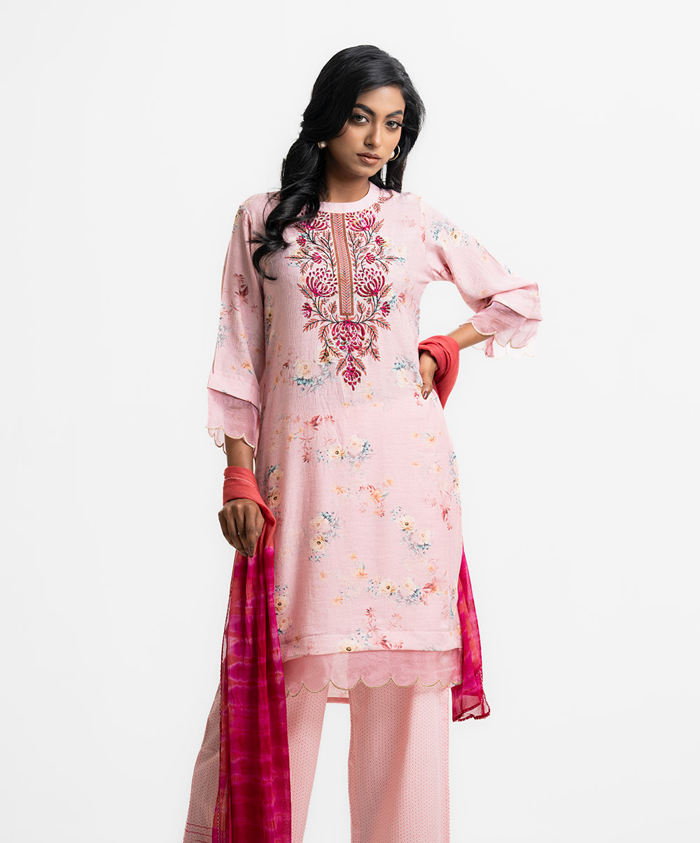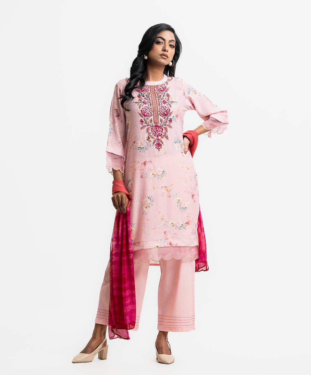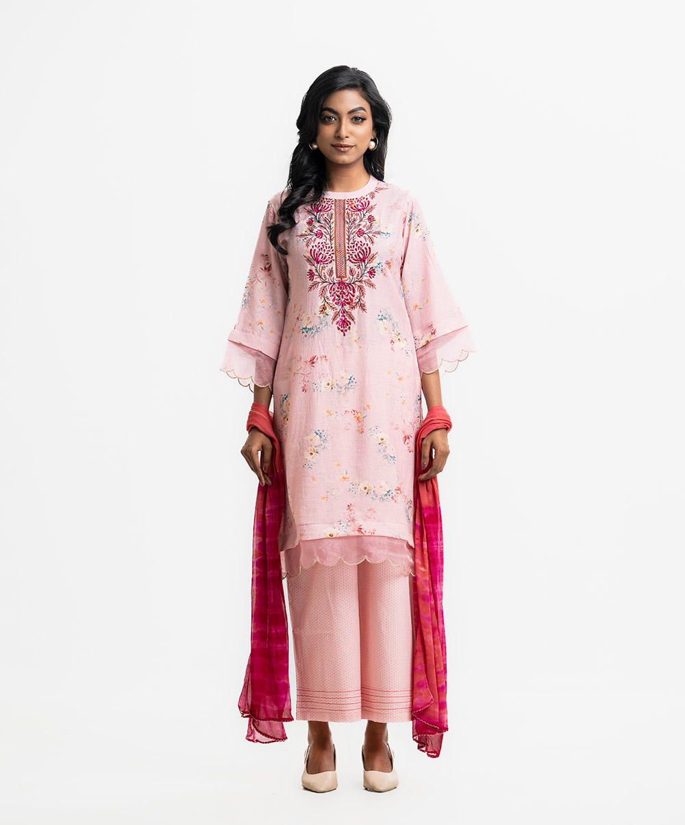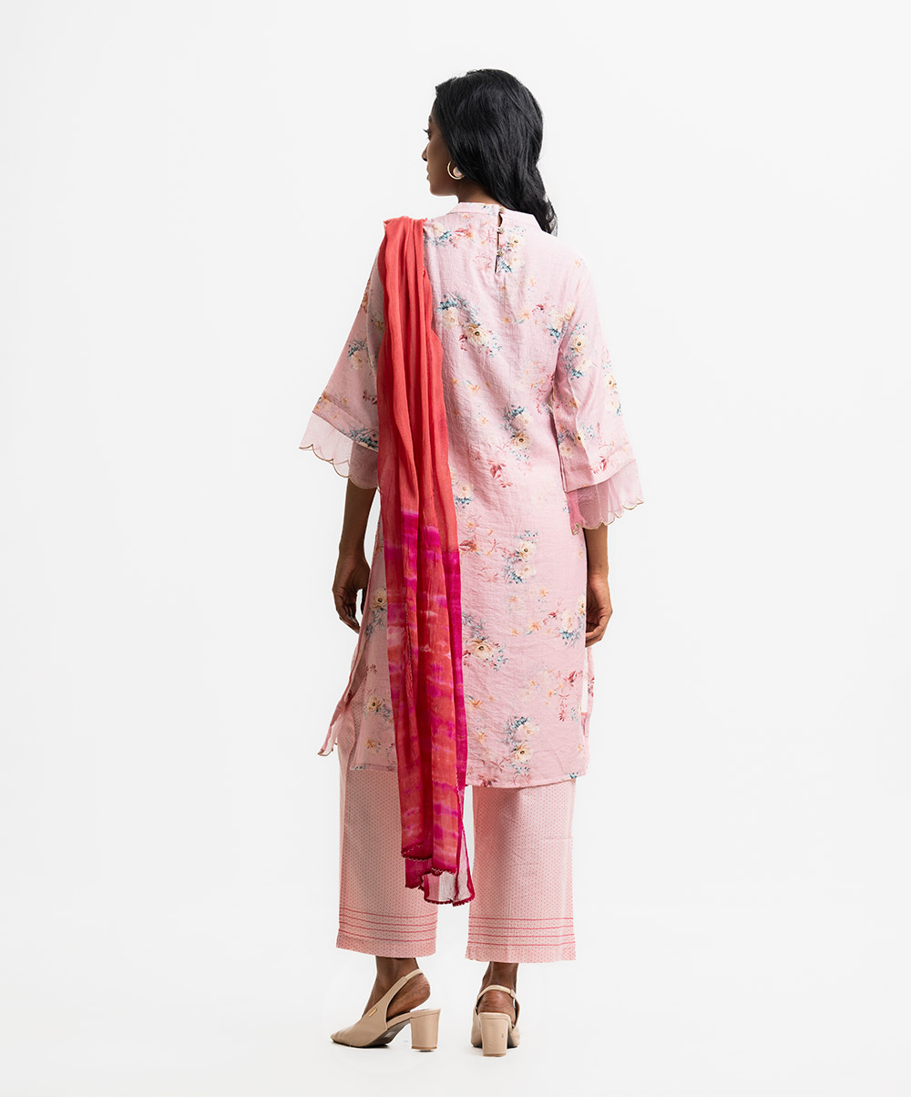 Women’s printed salwar kameez in cotton-blended fabric. Mock neck, muslin patch at bell sleeves cuff & hemline, heavy karchupi at the front of kameez. Chiffon dupatta with palazzo pants.