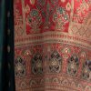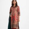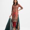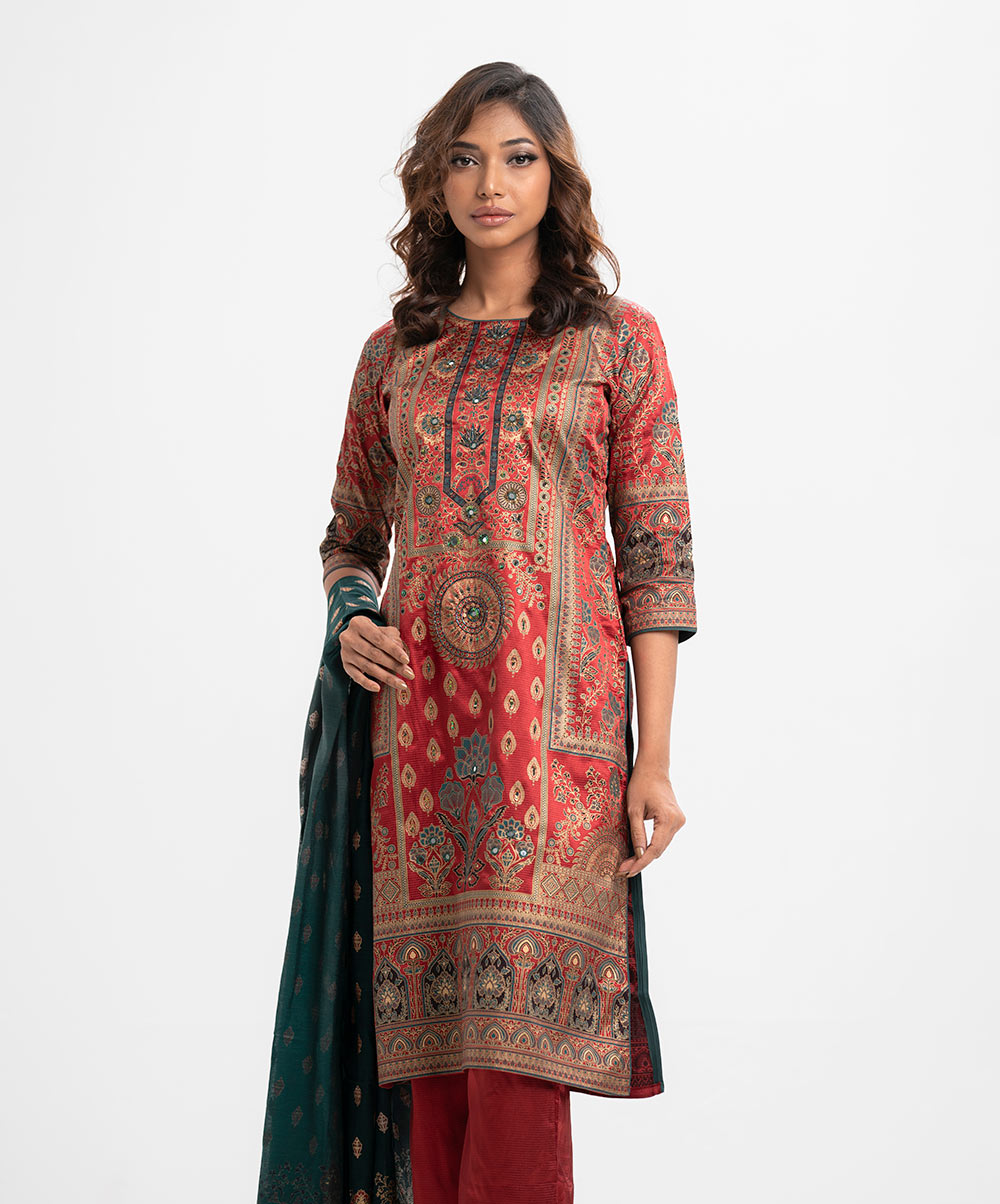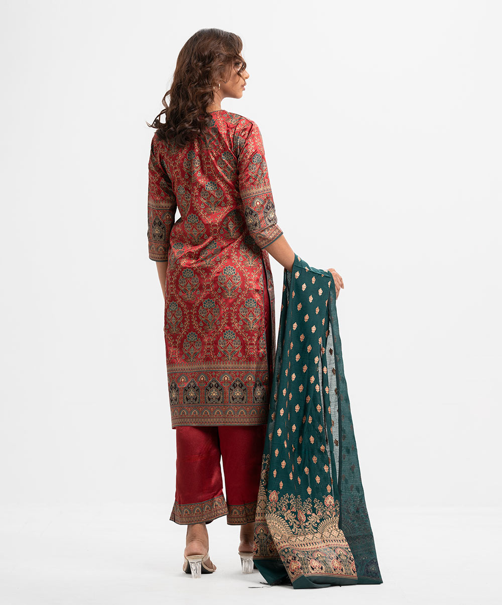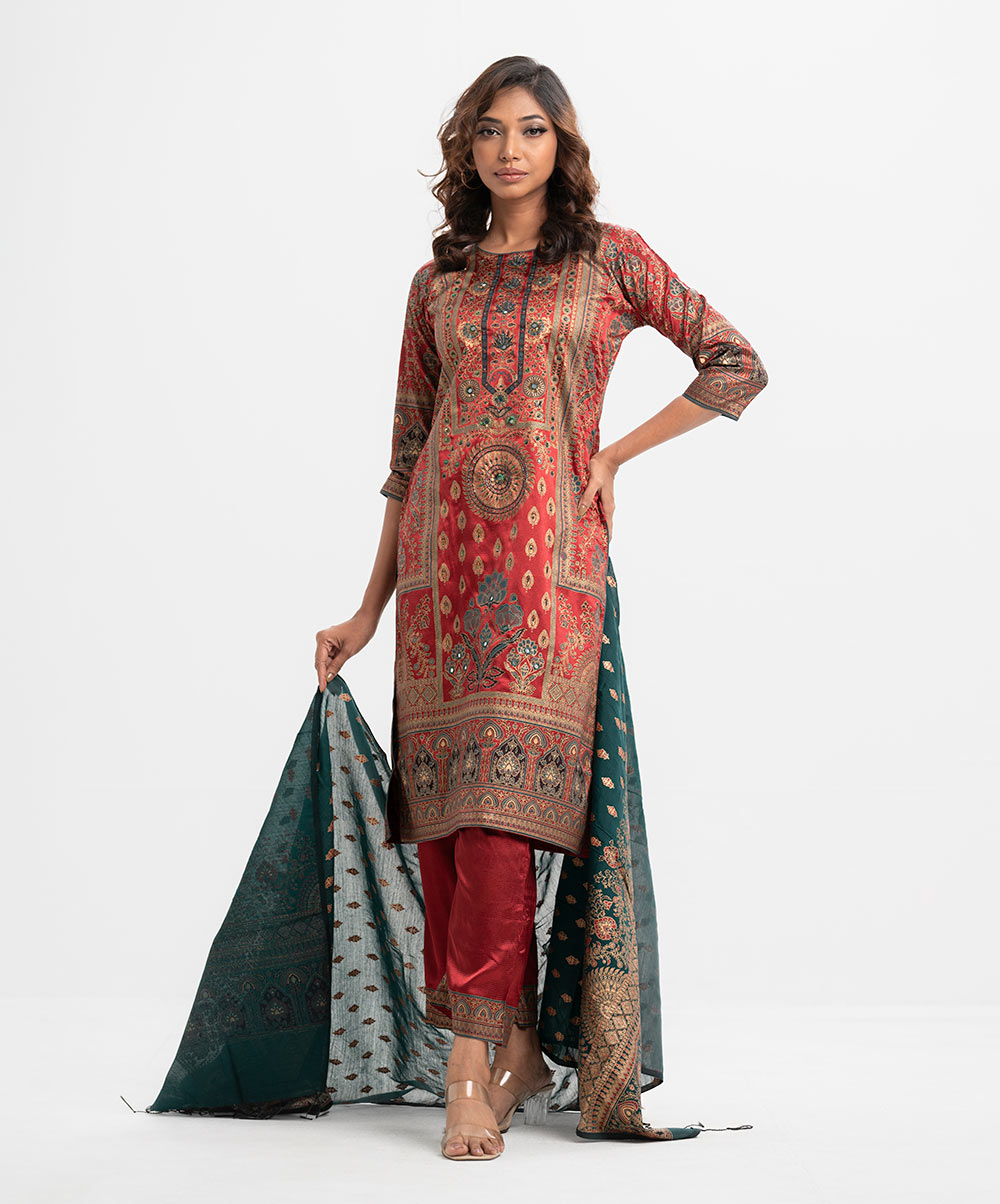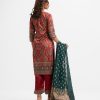 Women’s printed salwar kameez in crepe fabric. Round neck, three-quarter sleeves and karchupi at the front. Complemented with crepe palazzo pant and a half silk dupatta.