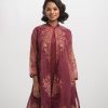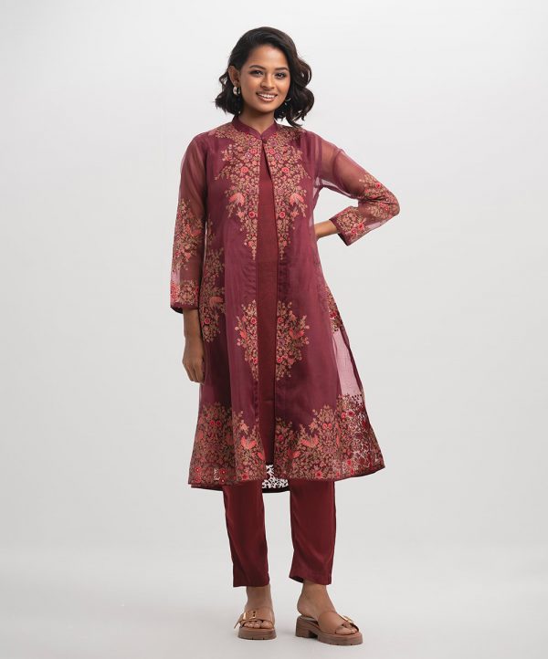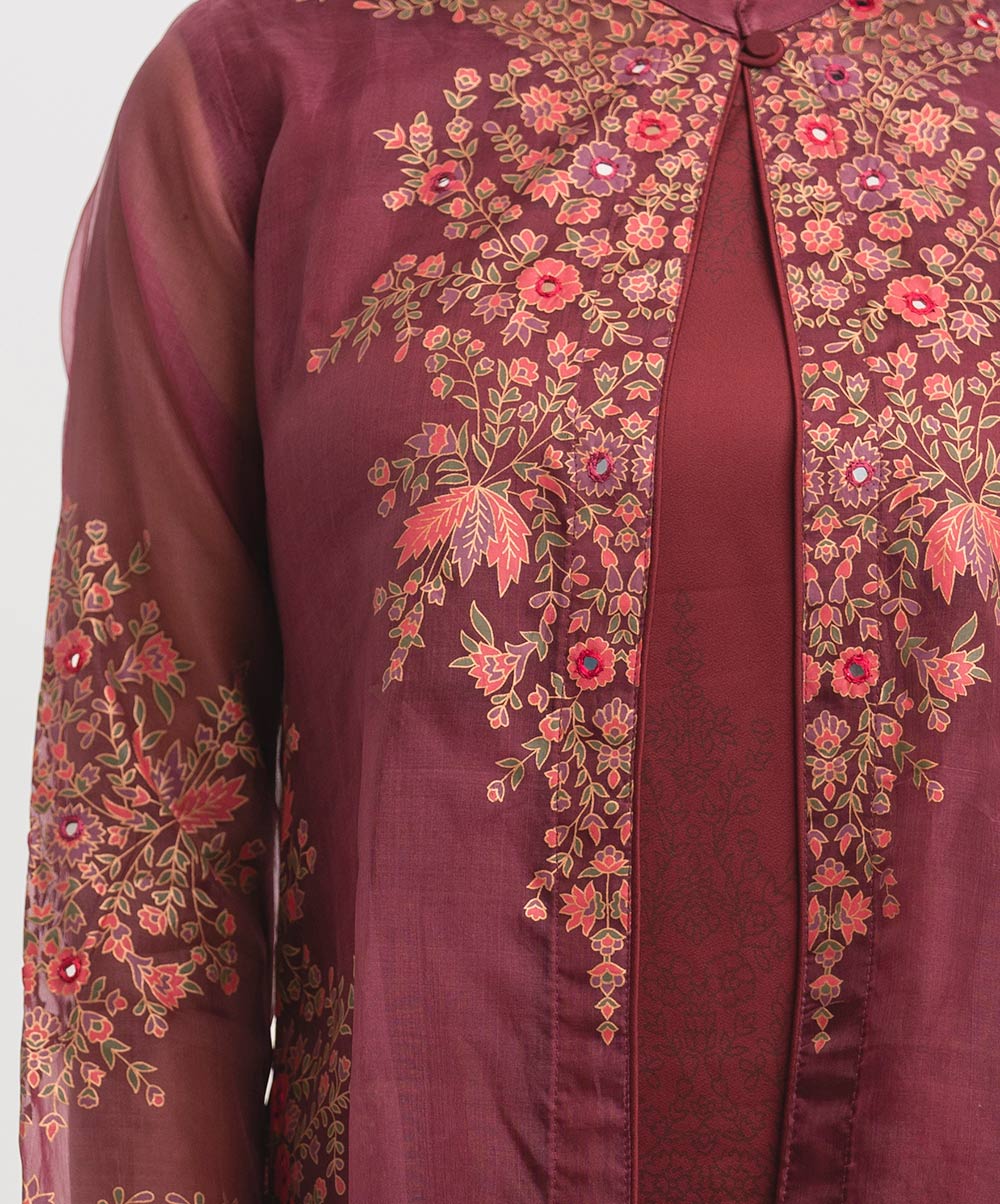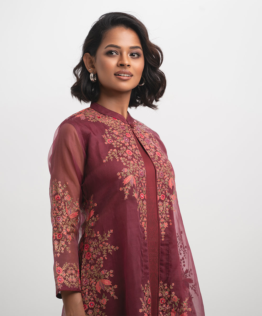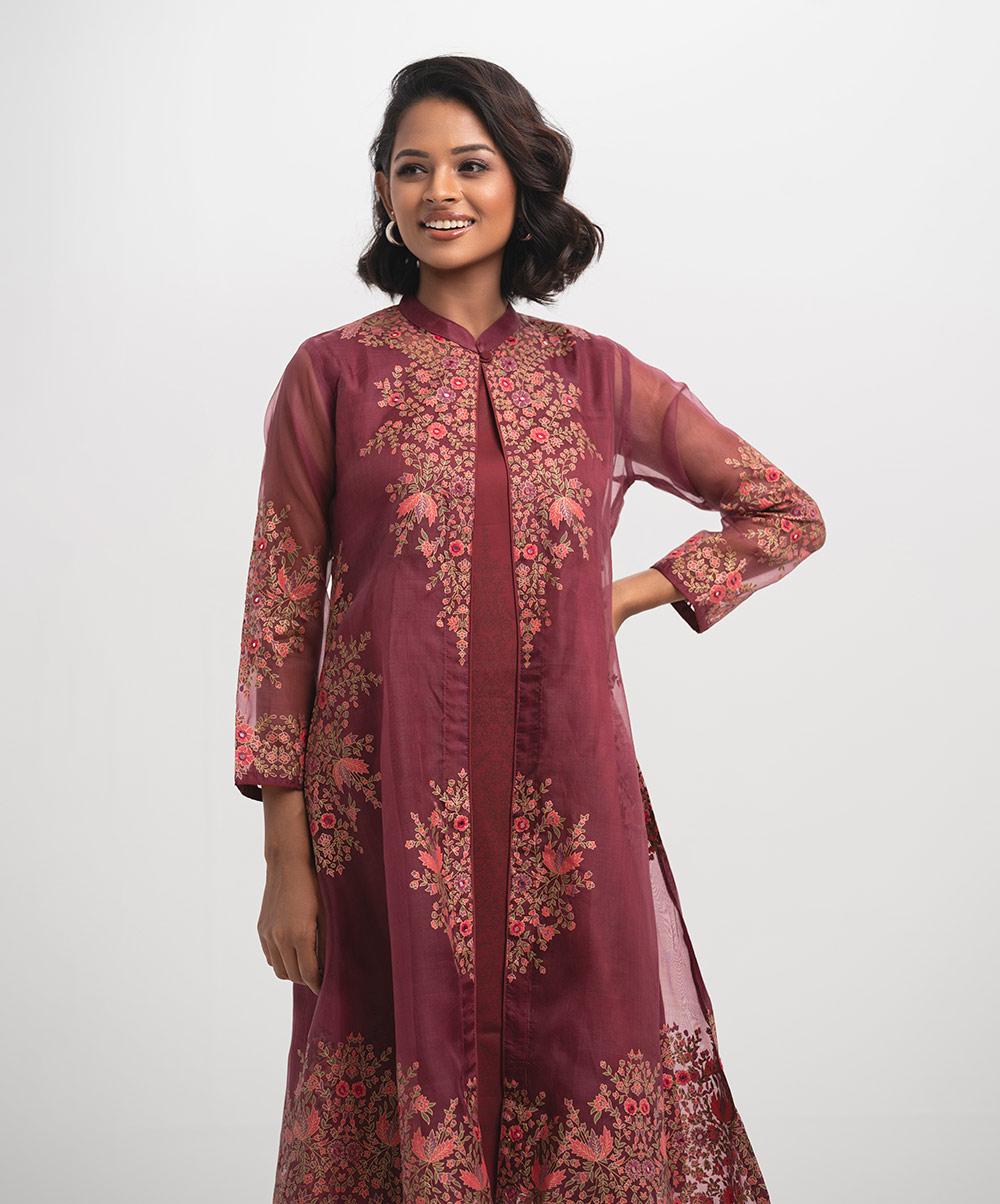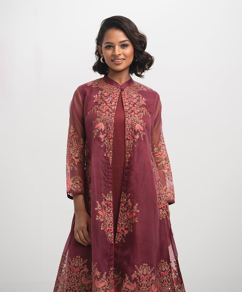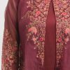 Women’s exclusive shrug style salwar kameez in Nargisus by Le Reve. Floral printed shrug in muslin fabric with georgette inner tunic. Mandarin collar, full sleeves and karchupi at the front of the shrug with palazzo pants.