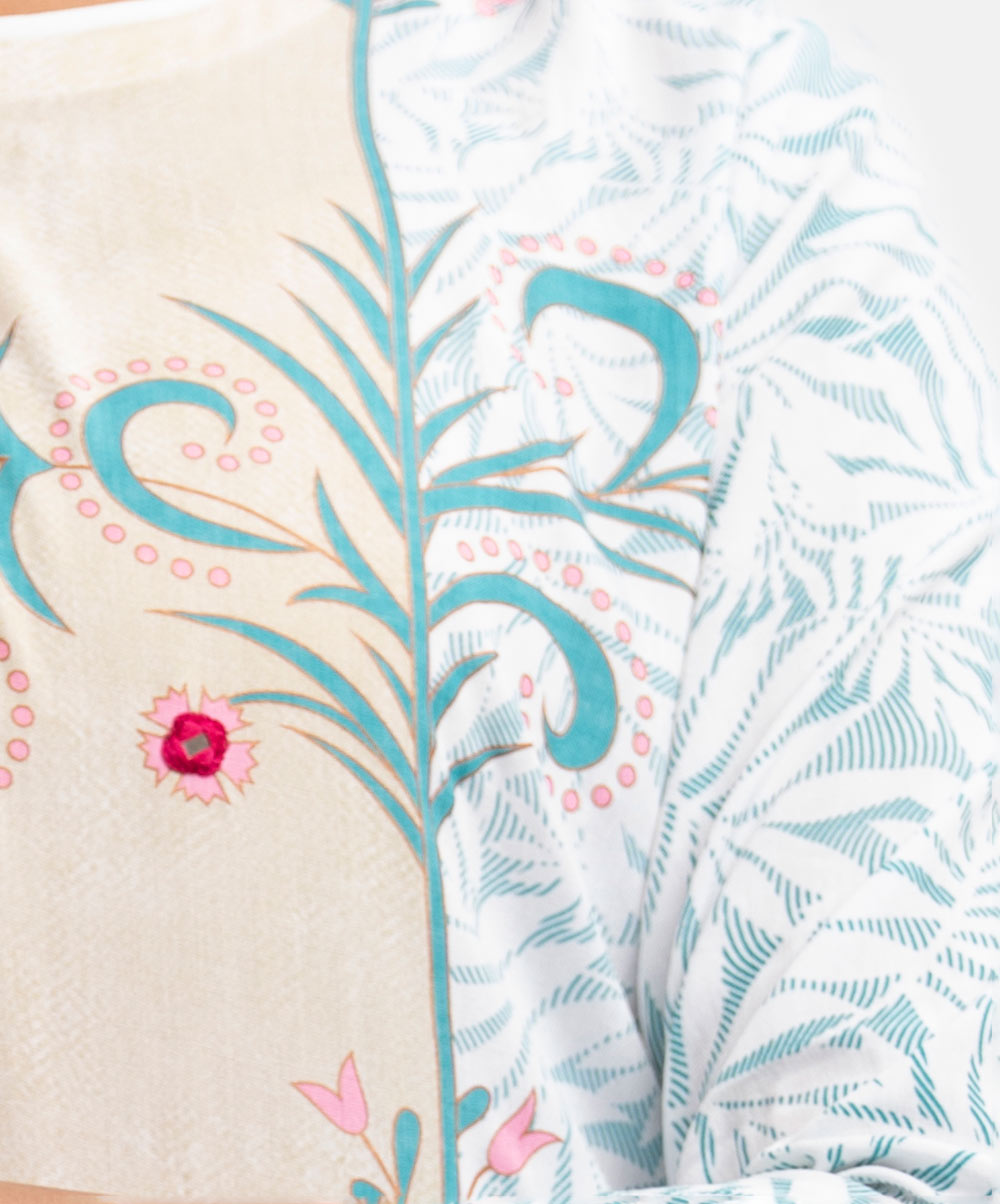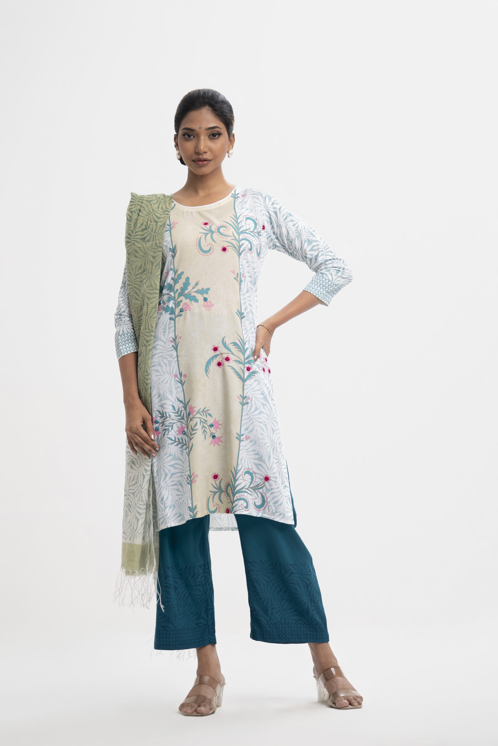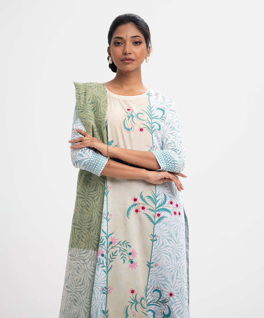 Women’s printed straight salwar kameez in viscose fabric. Round neck, three-quarter sleeves and karchupi at the front of the kameez. Palazzo pants and half-silk dupatta.