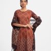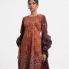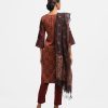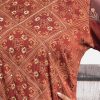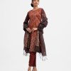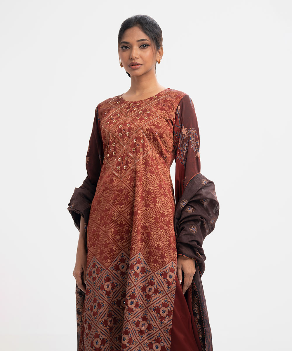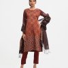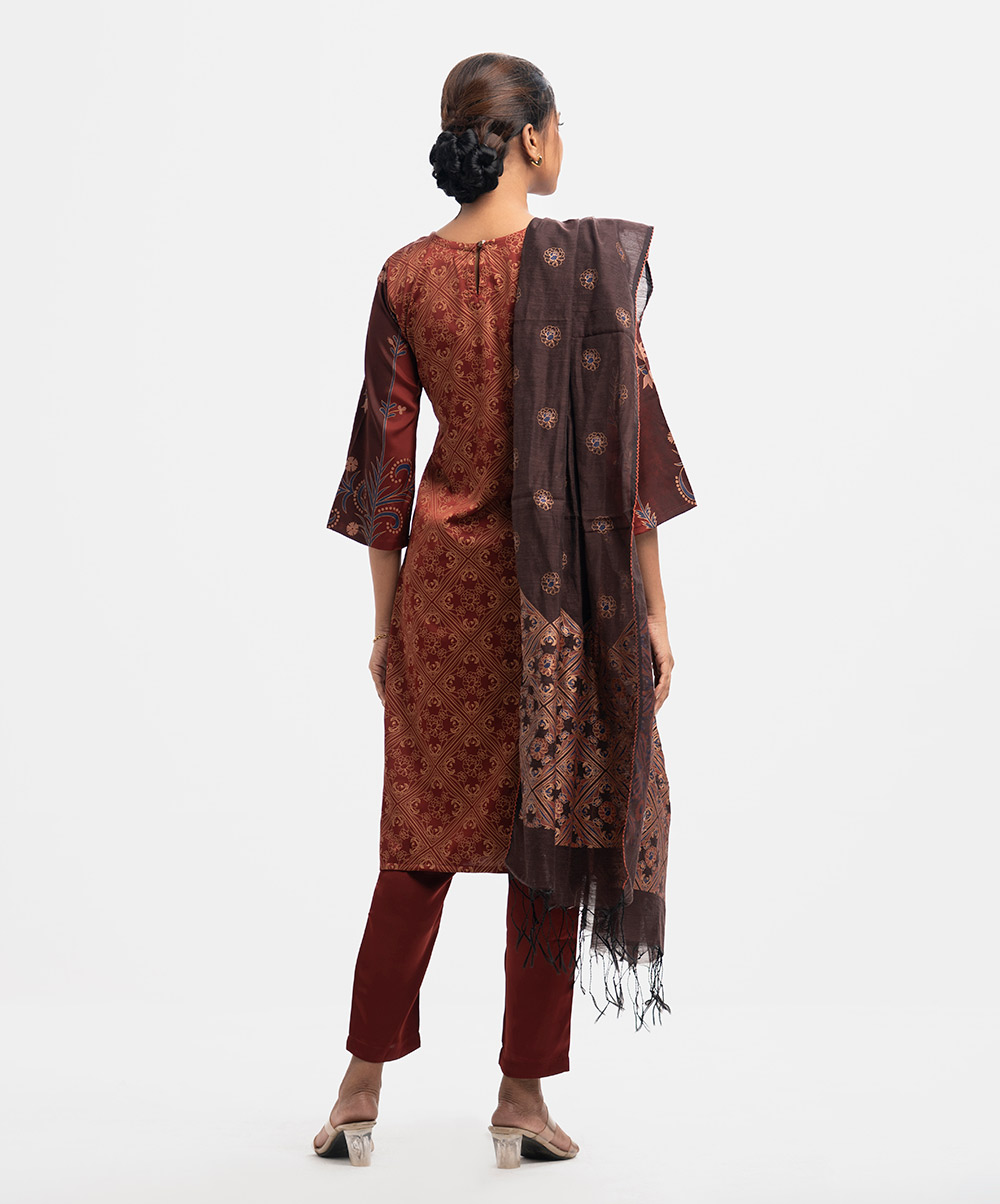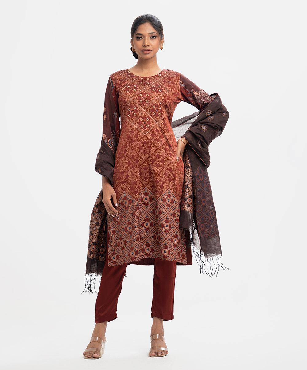 Women’s printed salwar kameez in georgette fabric. Round neck, three-quarter sleeves and karchupi at the front of kameez. Half-silk dupatta with pant-style pajamas.