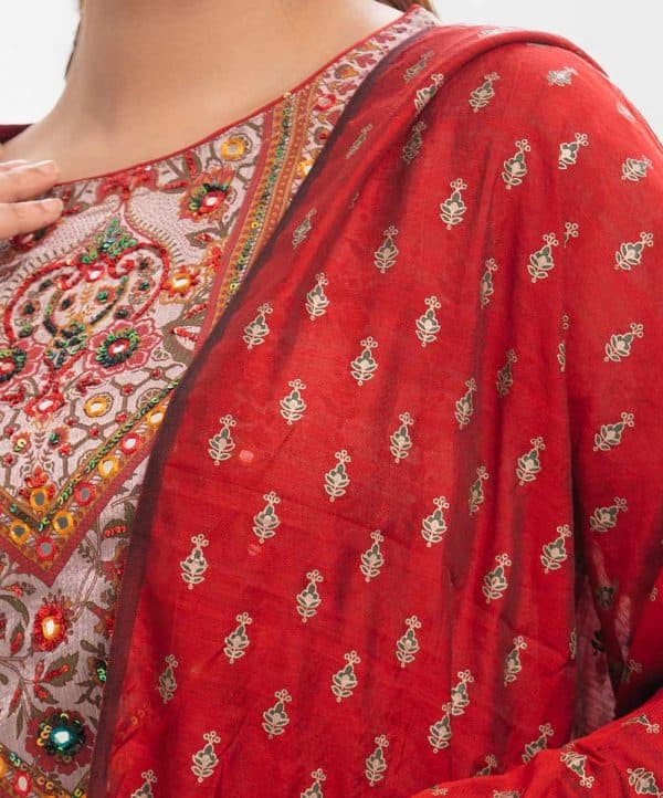 Women’s printed salwar kameez in textured georgette fabric. Round neck, three-quarter sleeves and karchupi at the front of kameez. Half-silk dupatta with cotton & silk blended fabric palazzo pants.