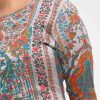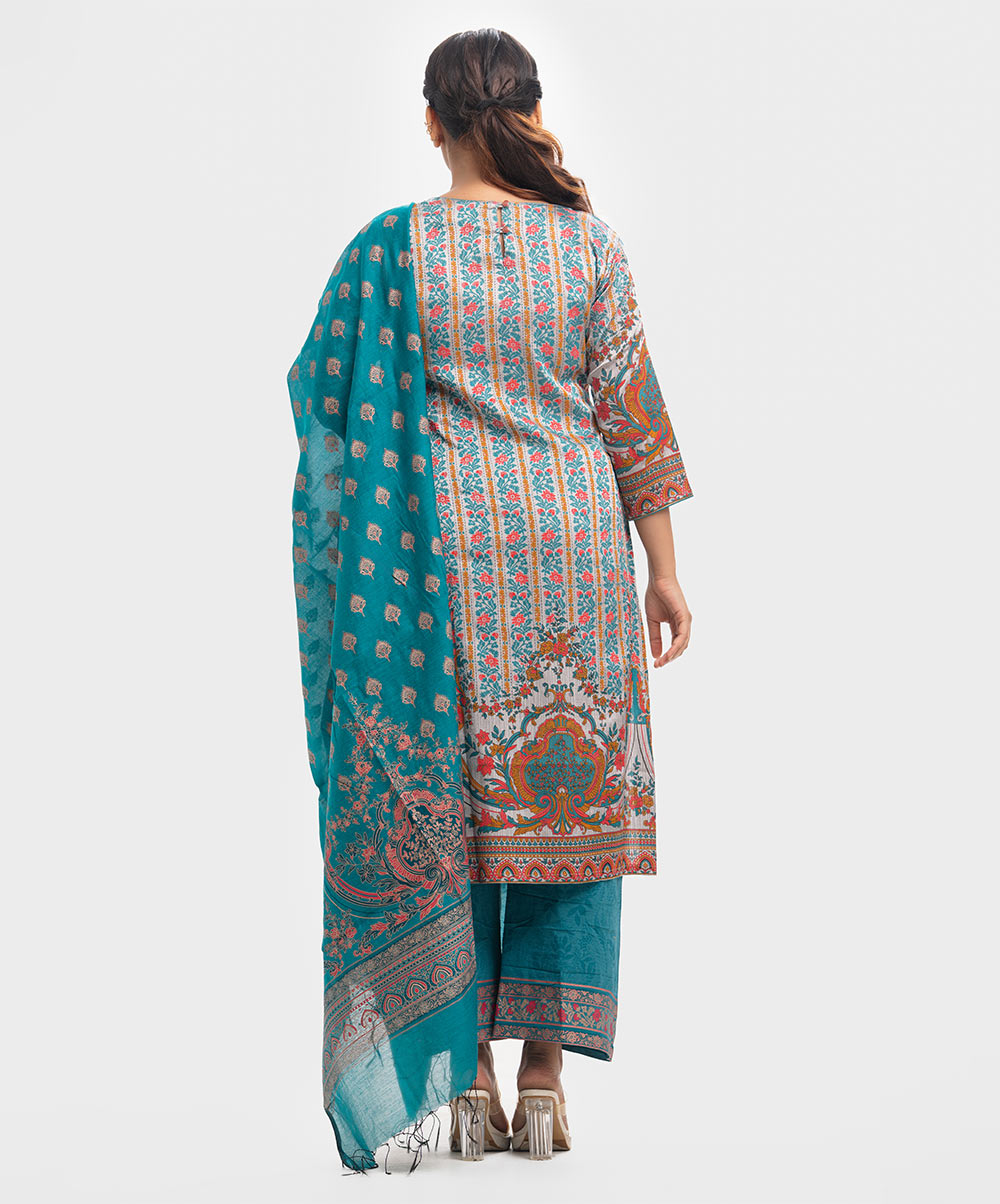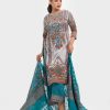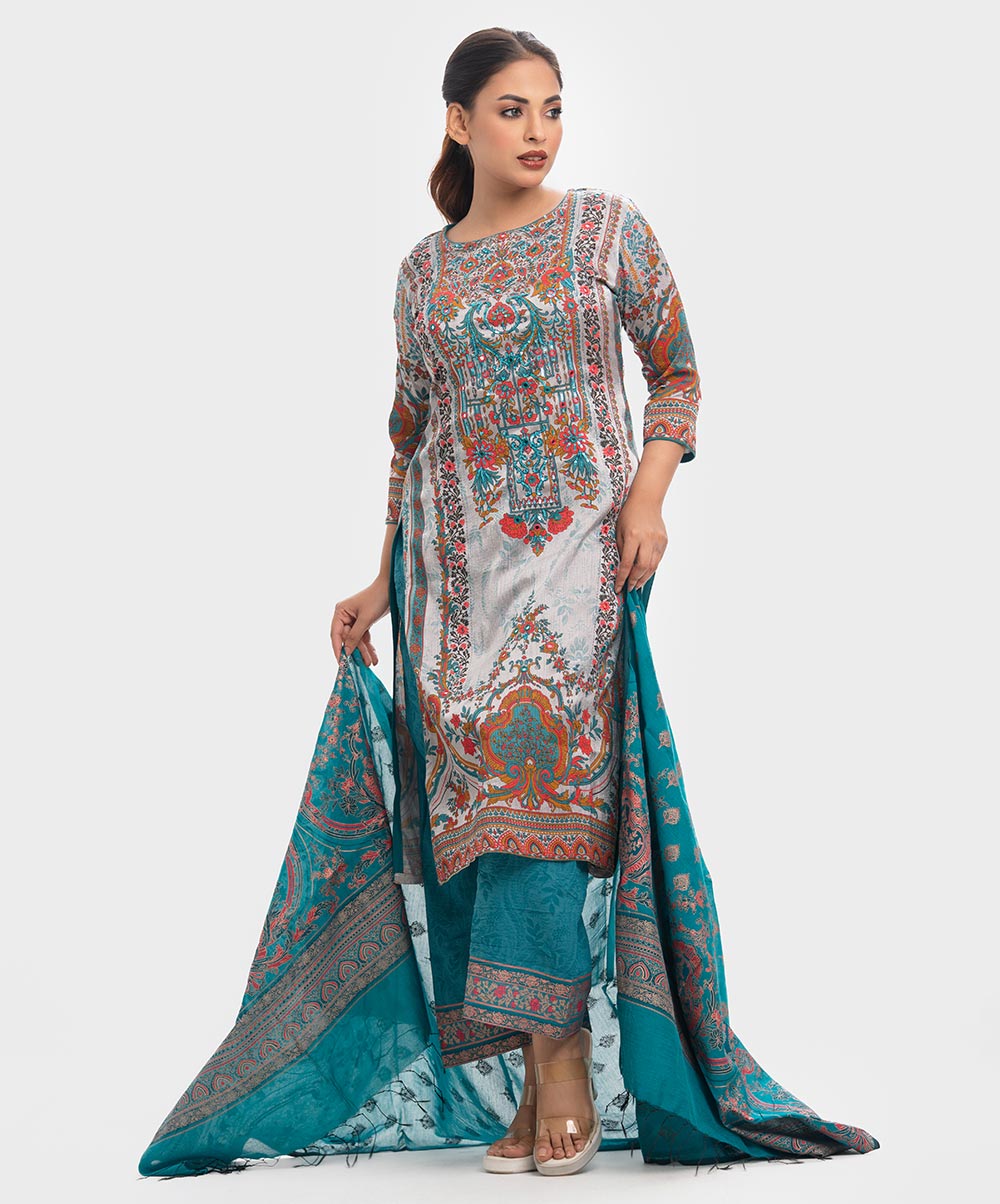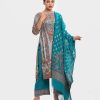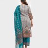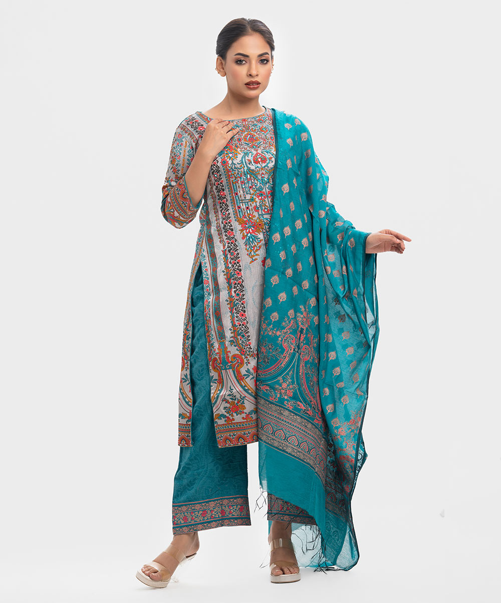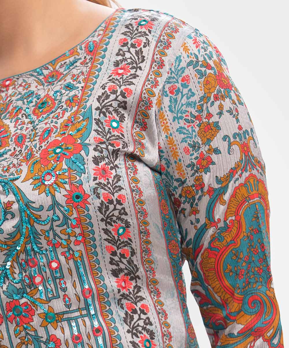 Women’s printed salwar kameez in textured georgette fabric. Boat neck, three-quarter sleeves and karchupi at the front of kameez. Half-silk dupatta with stretchable georgette fabric palazzo pants.