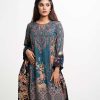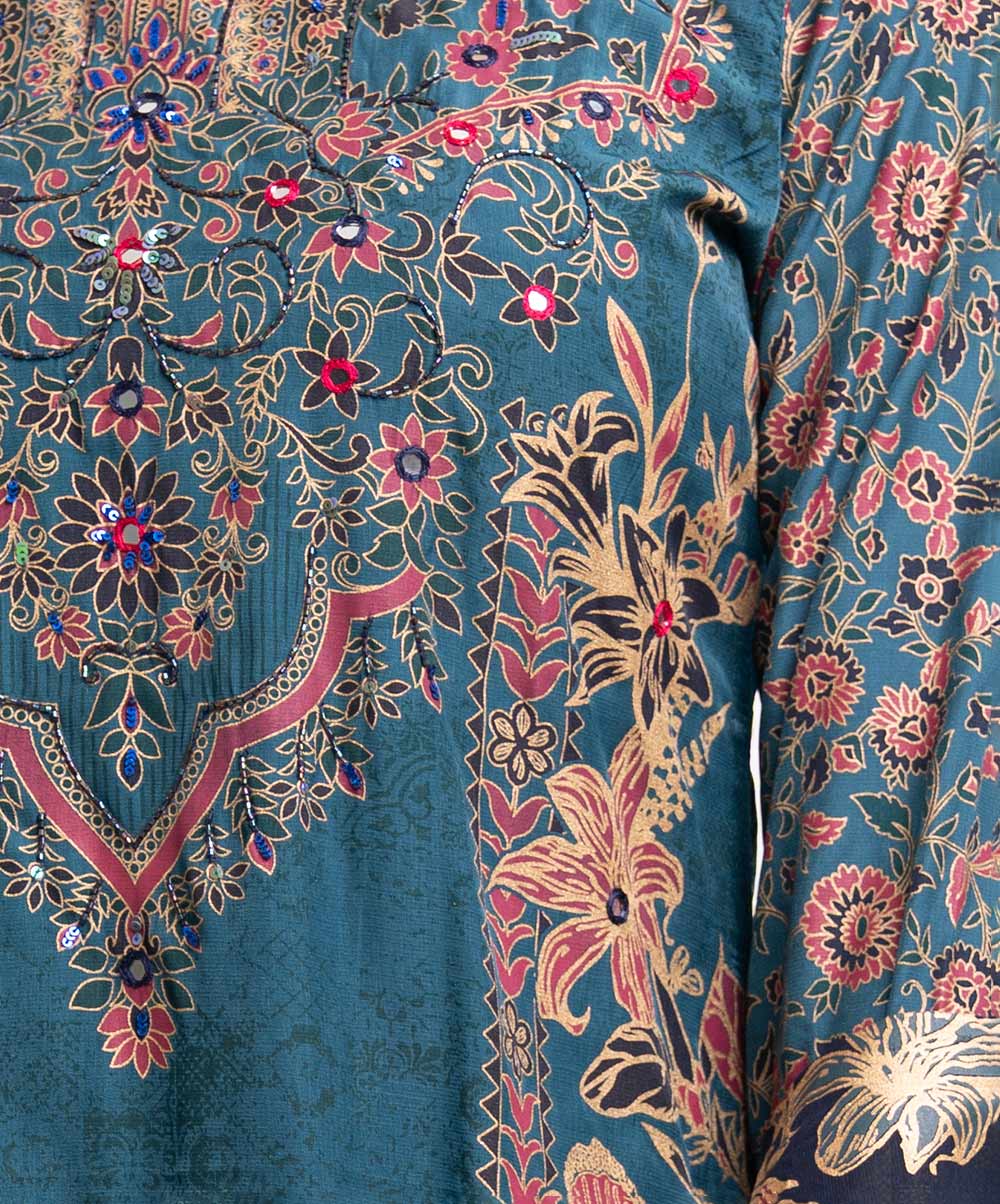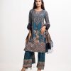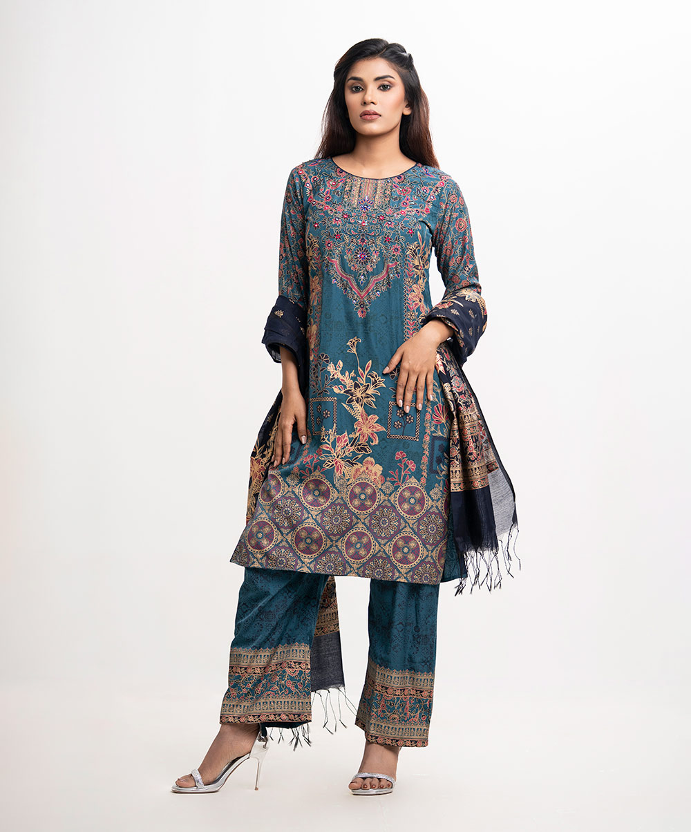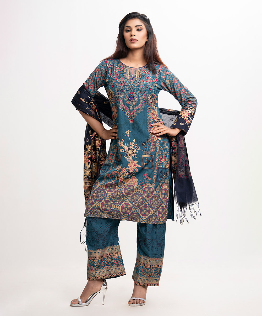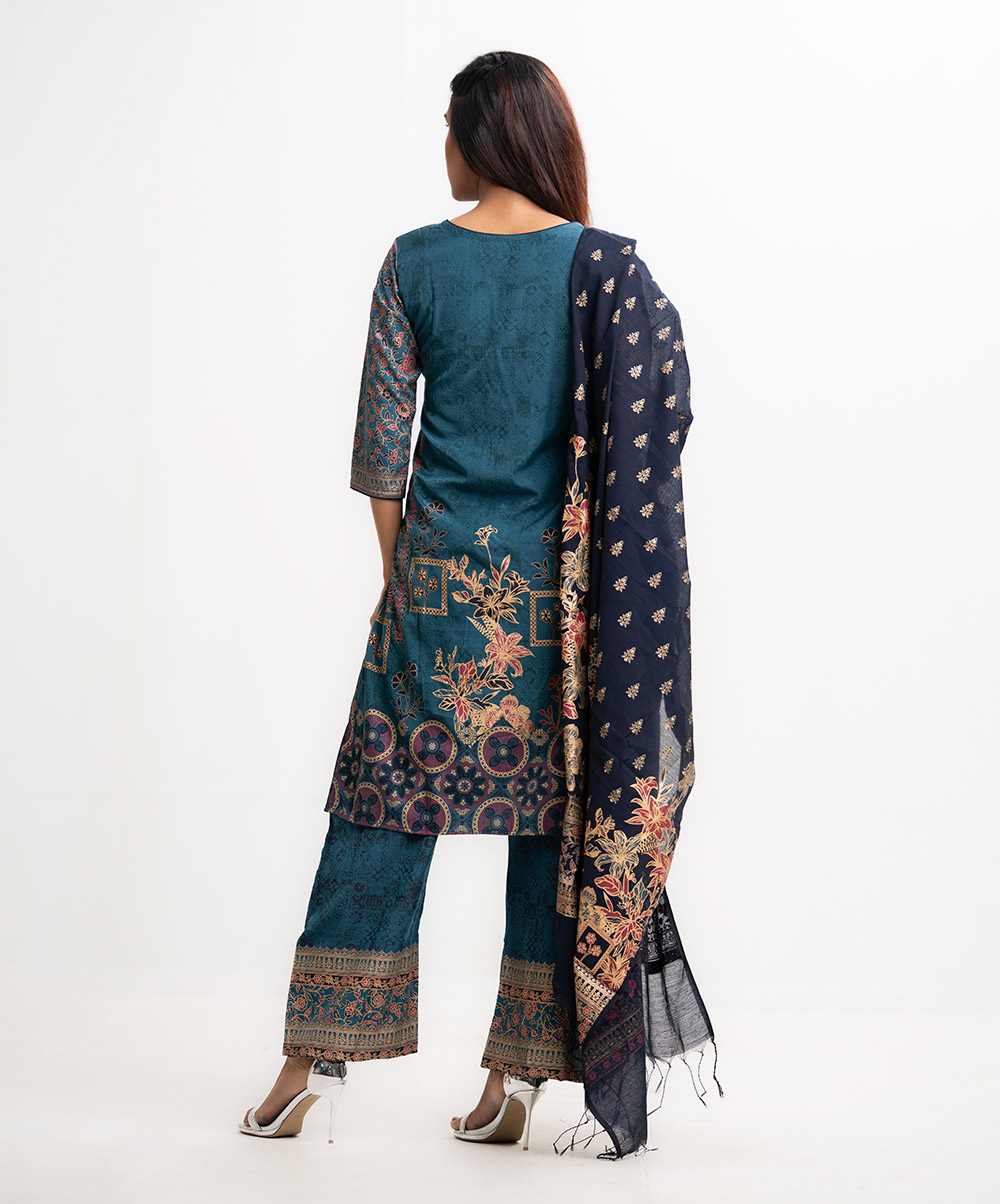 Women’s printed salwar kameez in cotton-blended fabric. Round neck, three-quarter sleeves and heavy karchupi detail kameez. Palazzo pants and half-silk dupatta.