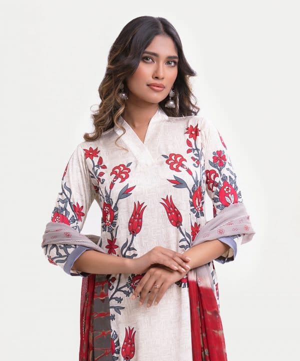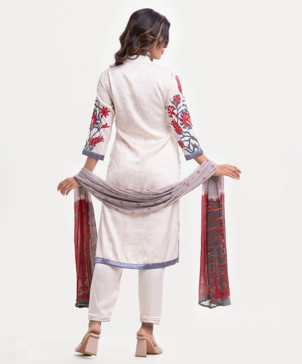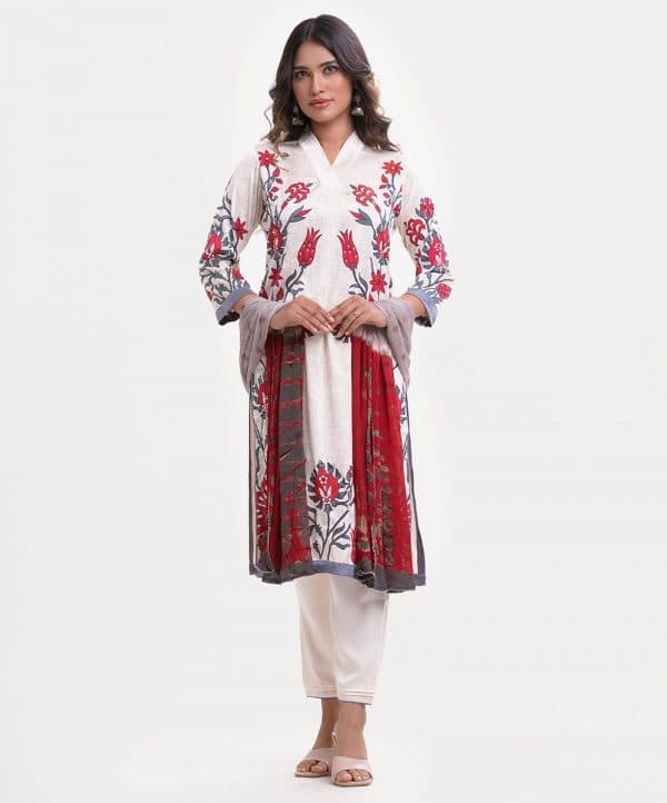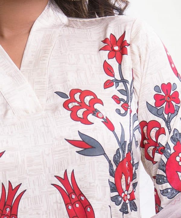 Women’s printed salwar kameez in blended fabric. V-neck, three-quarter sleeves, heavy karchupi at the front of kameez. Chiffon dupatta with pant-style pajama.