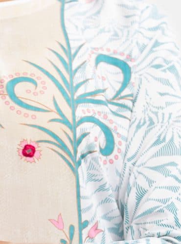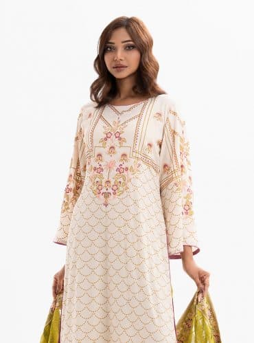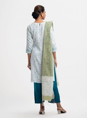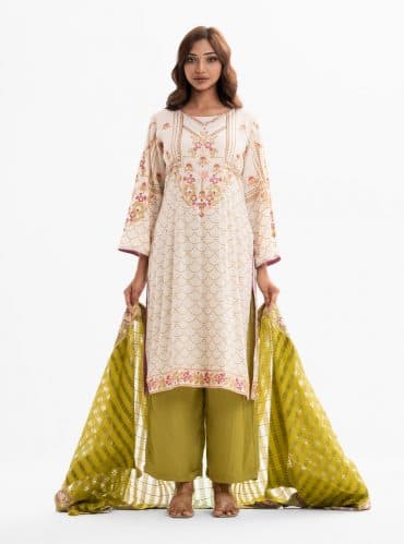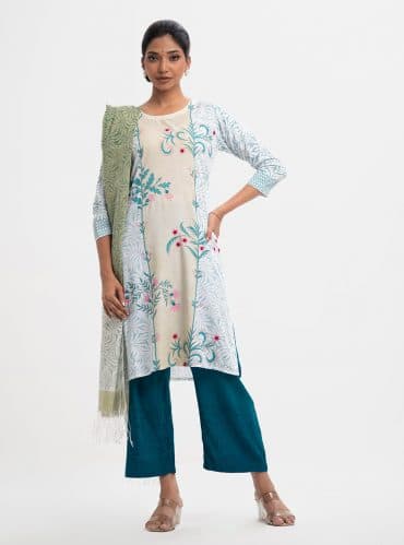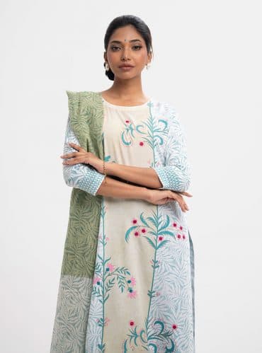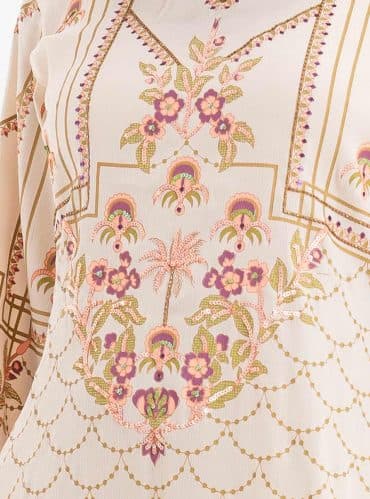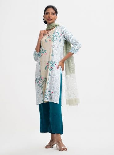 Women’s printed salwar kameez in blended fabric. V-neck, three-quarter sleeves, heavy karchupi at the front of kameez. Chiffon dupatta with pant-style pajama.
