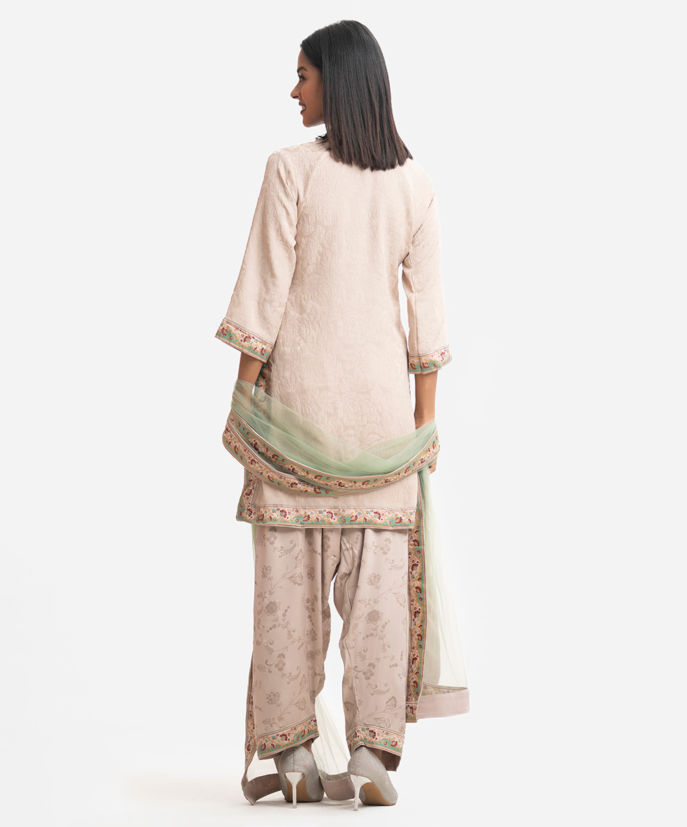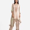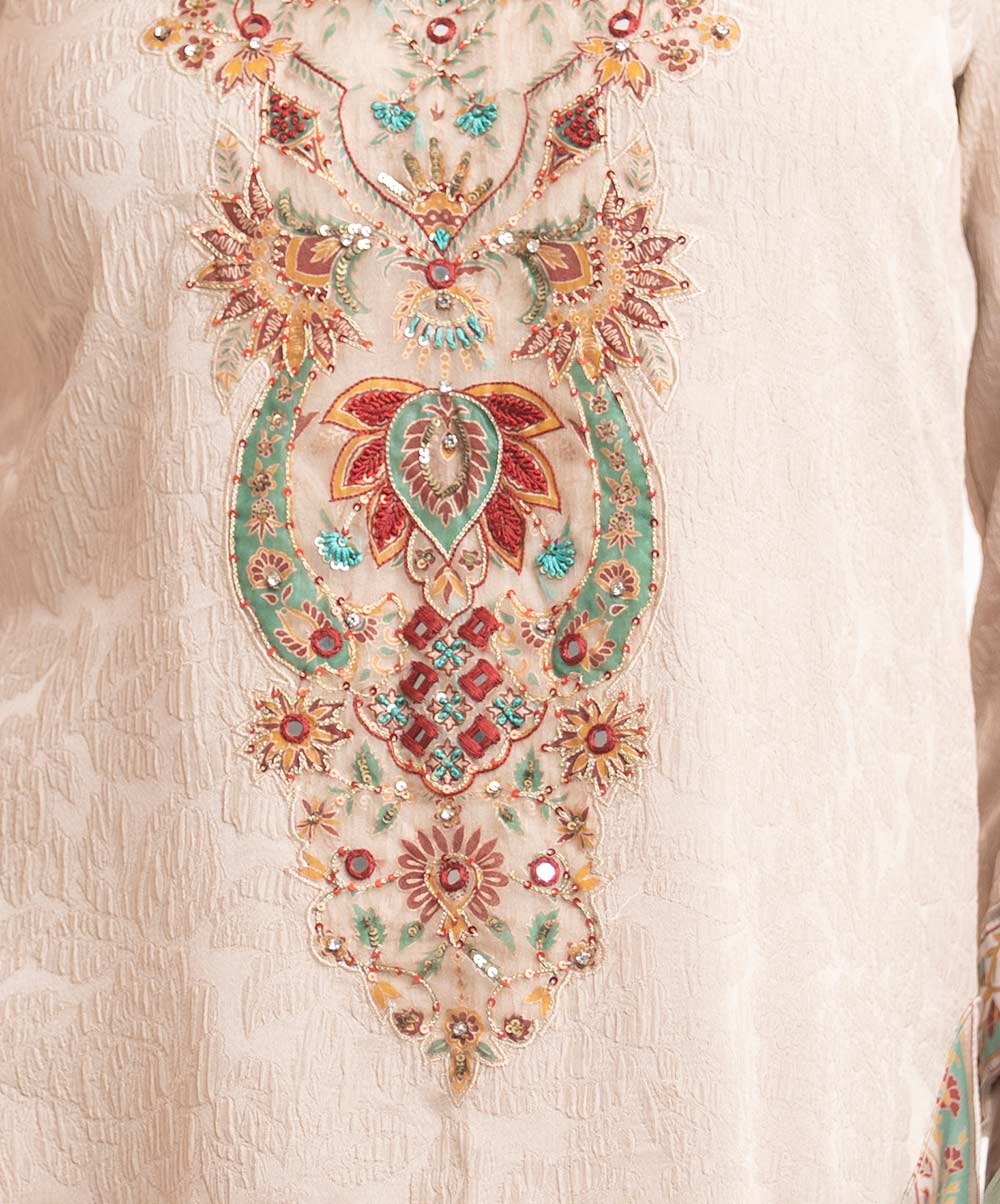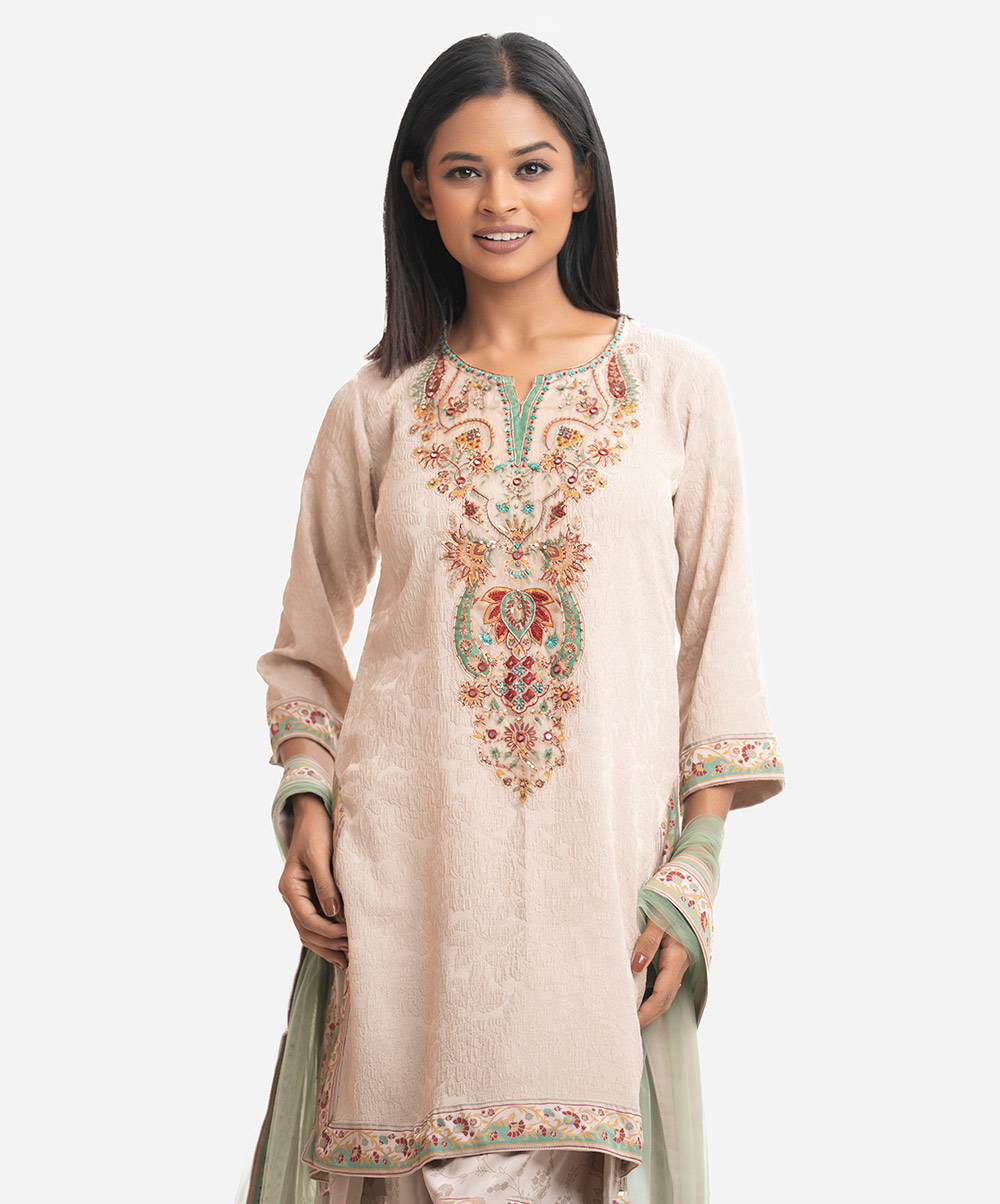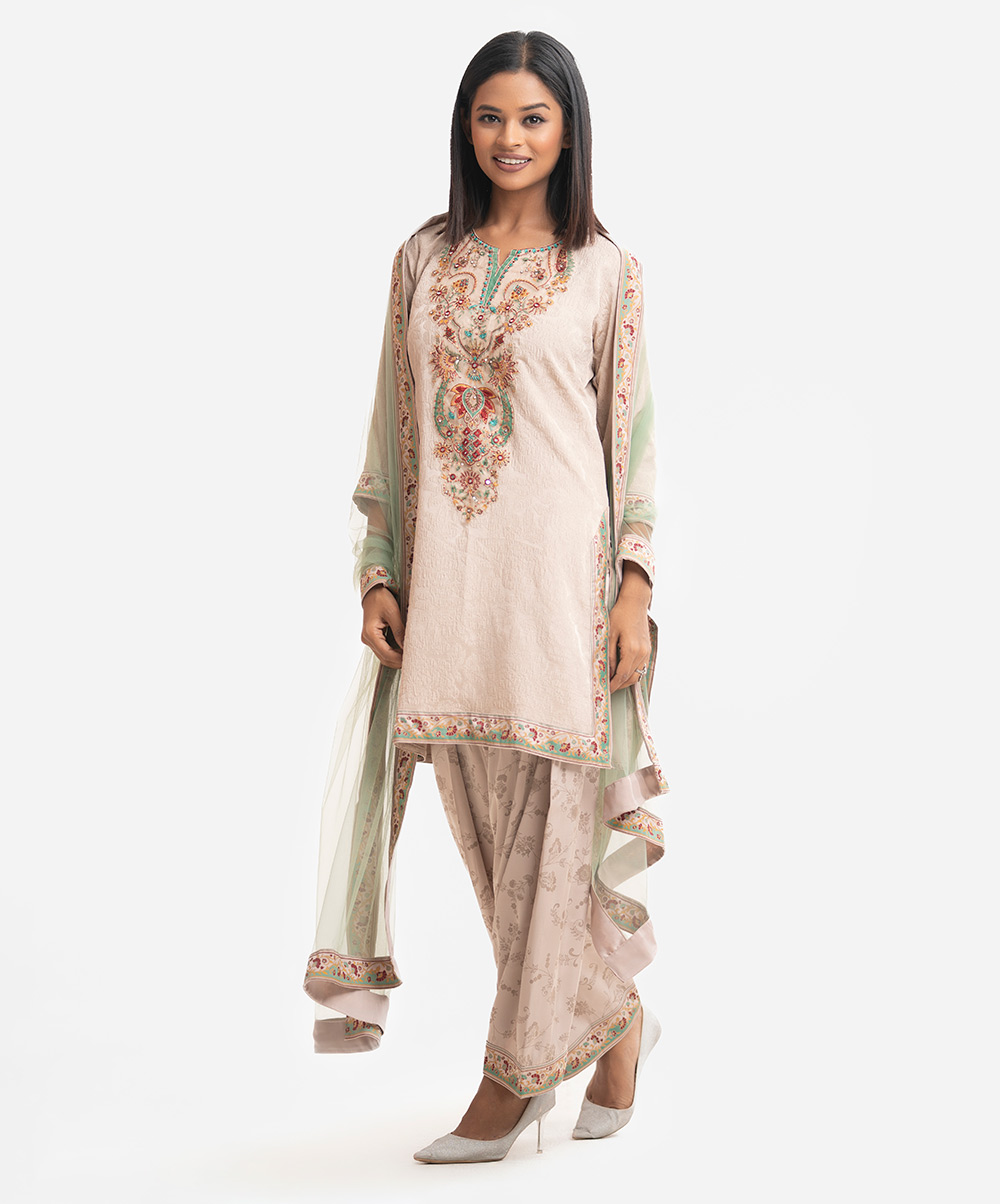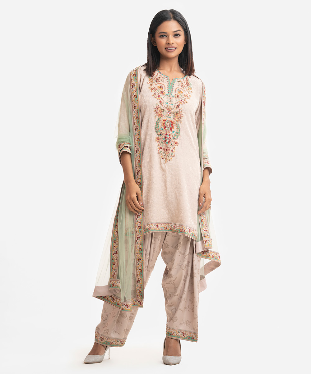 Women’s exclusive farshi salwar kameez in Nargisus by Le Reve. Round neck, three-quarter sleeves and muslin fabric patch with karchupi detail kameez in tencel blended fabric. With a organza dupatta & classic pajama.