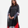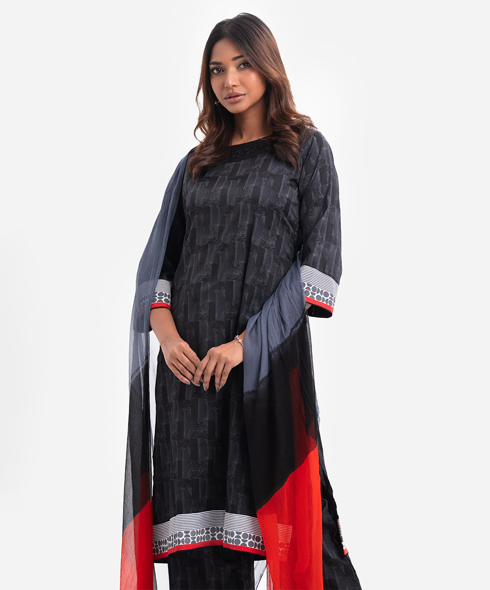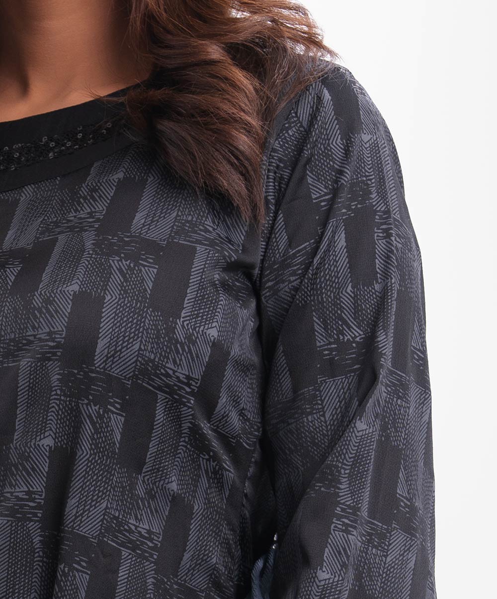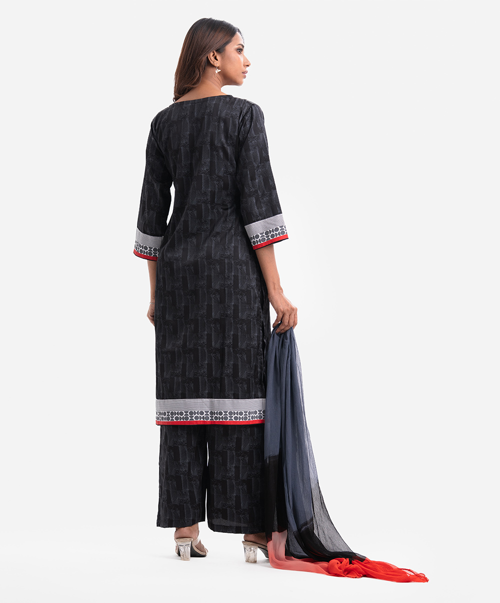 Women’s printed salwar kameez in crepe fabric. Boat neck with sequin fabric patch and three-quarter sleeves kameez. Chiffon dupatta with palazzo pants.