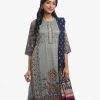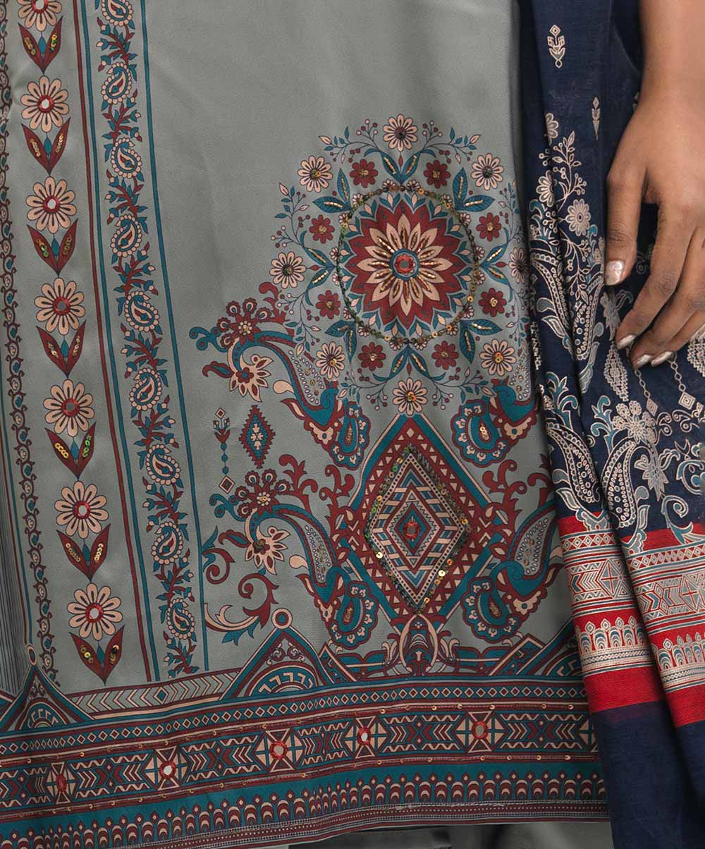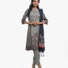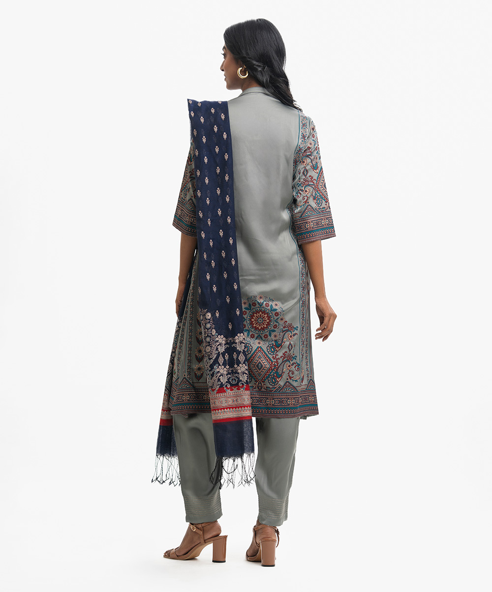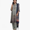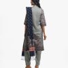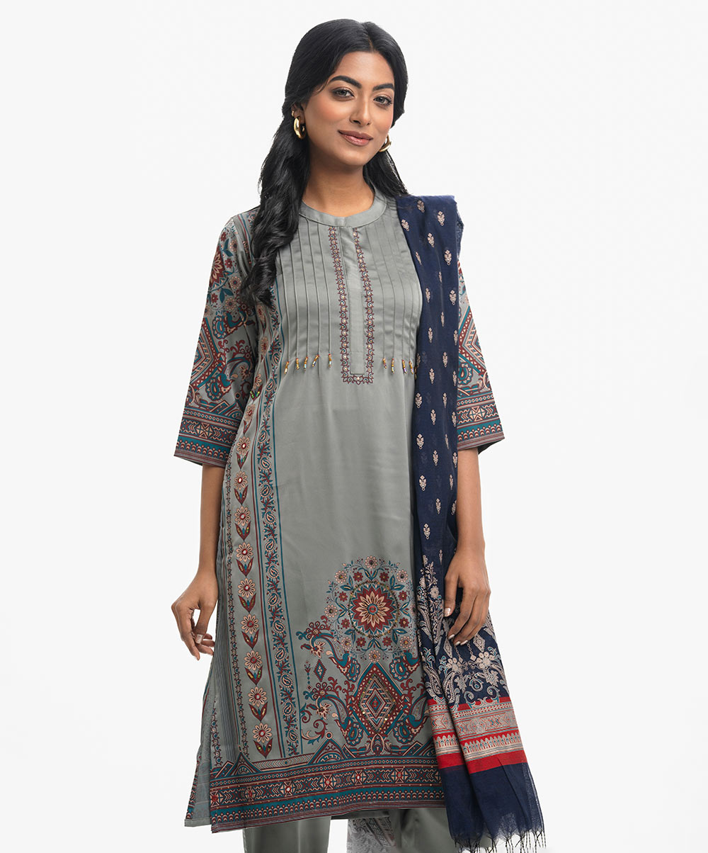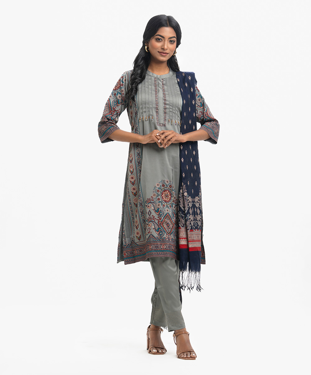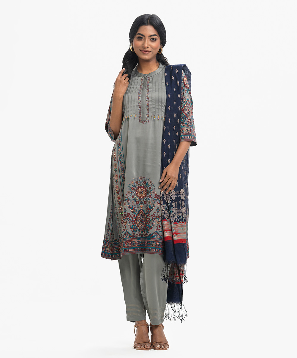 Women’s ethnic printed salwar kameez in blended fabric. Stand collar, three-quarter sleeves and heavy karchupi & pintuck detail at the front of kameez. Half-silk dupatta with classic pajama with embroidery work.