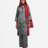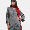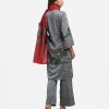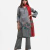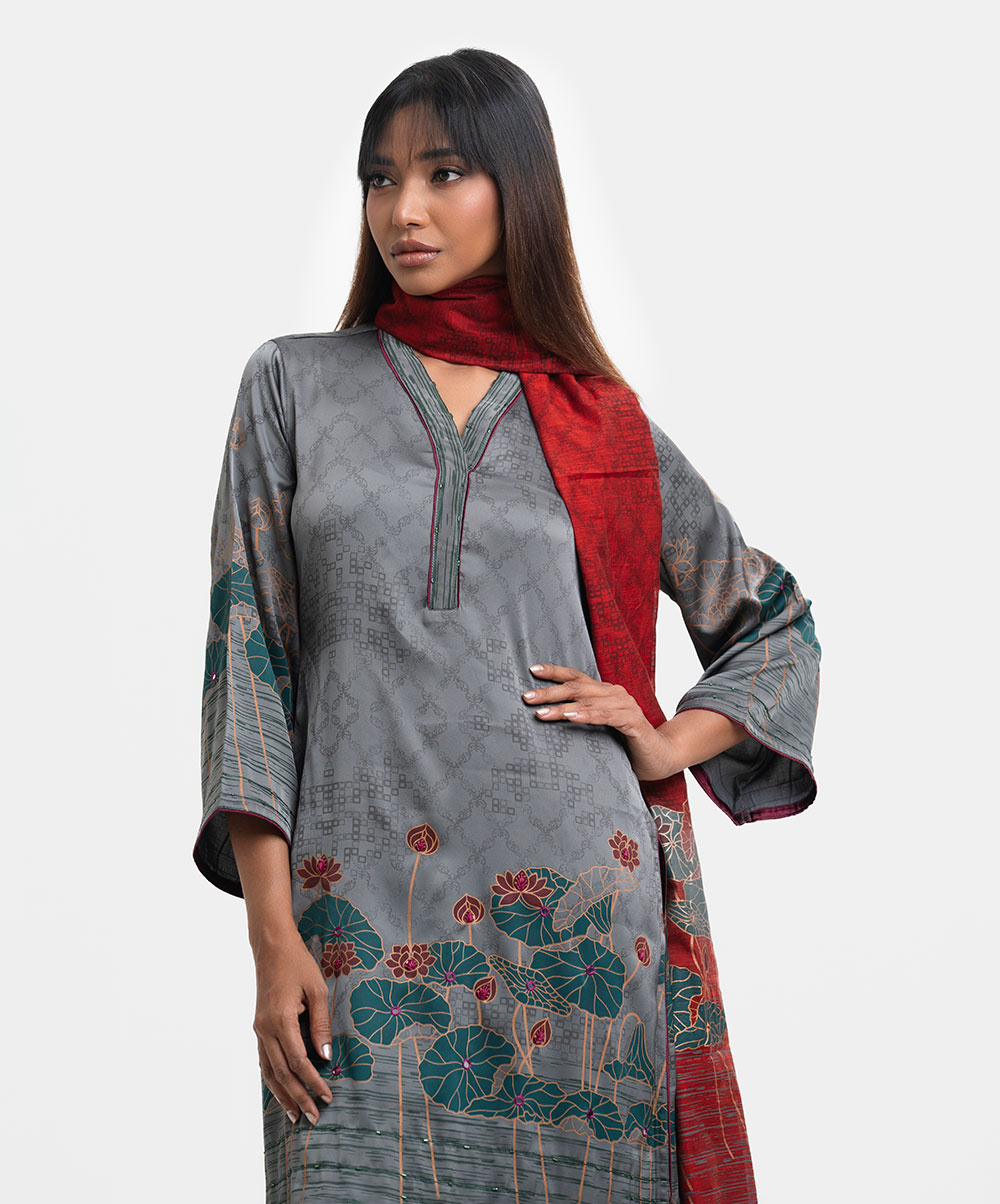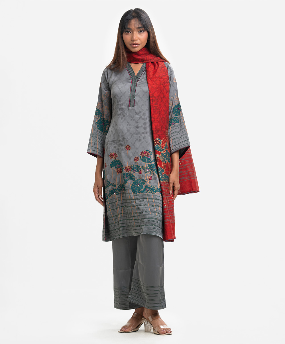 Women’s printed salwar kameez in georgette fabric. V-neck, three-quarter sleeves, karchupi at the front of kameez. Half-silk dupatta with palazzo pants.