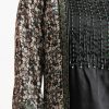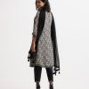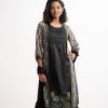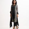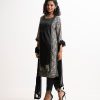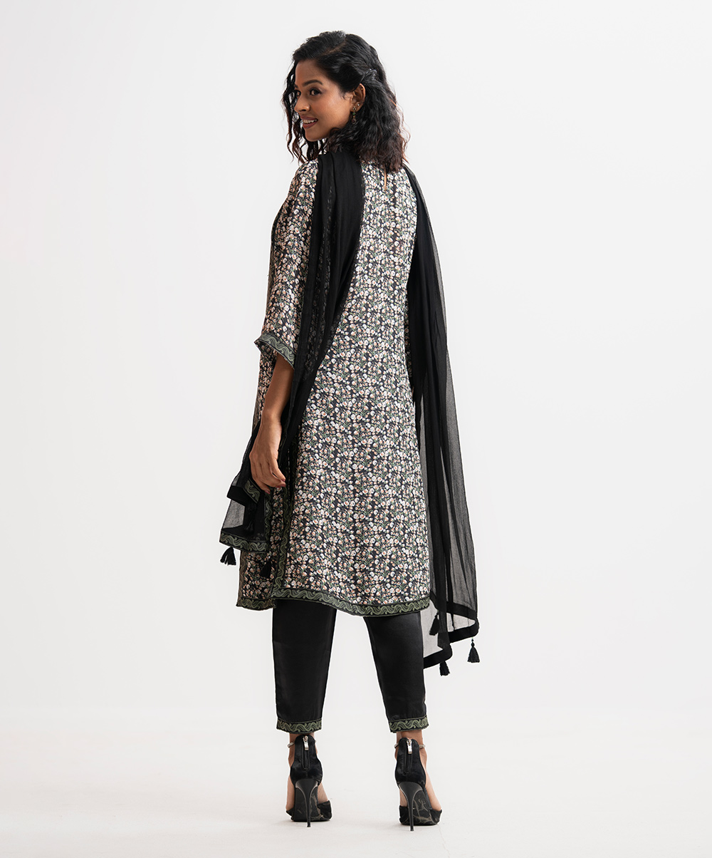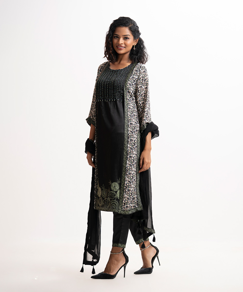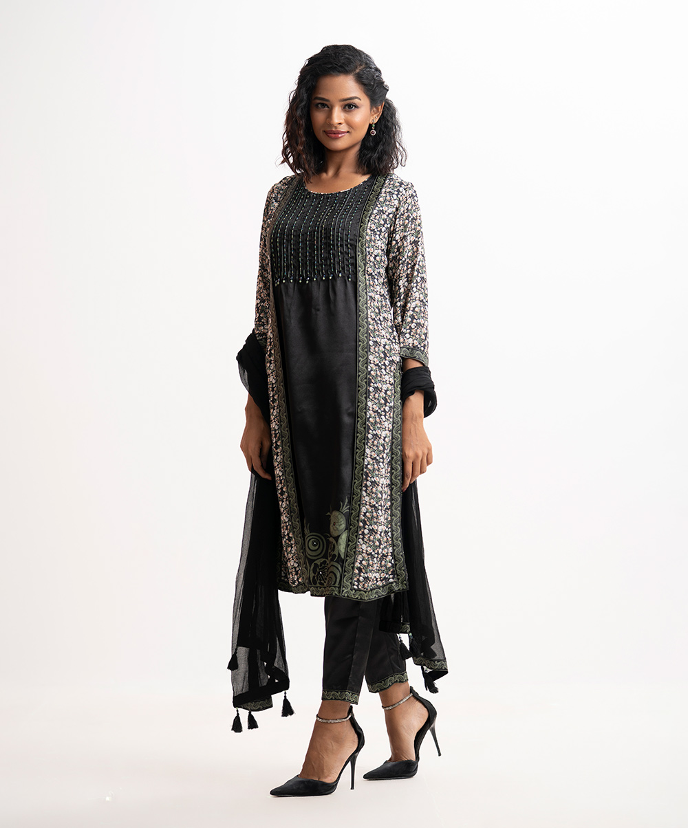 Women’s printed shrug style salwar kameez in georgette fabric attached shrug and crepe fabric lining. Round neck, three-quarter sleeves and karchupi details at front of kameez. Chiffon dupatta with pant-style pajama.