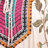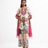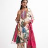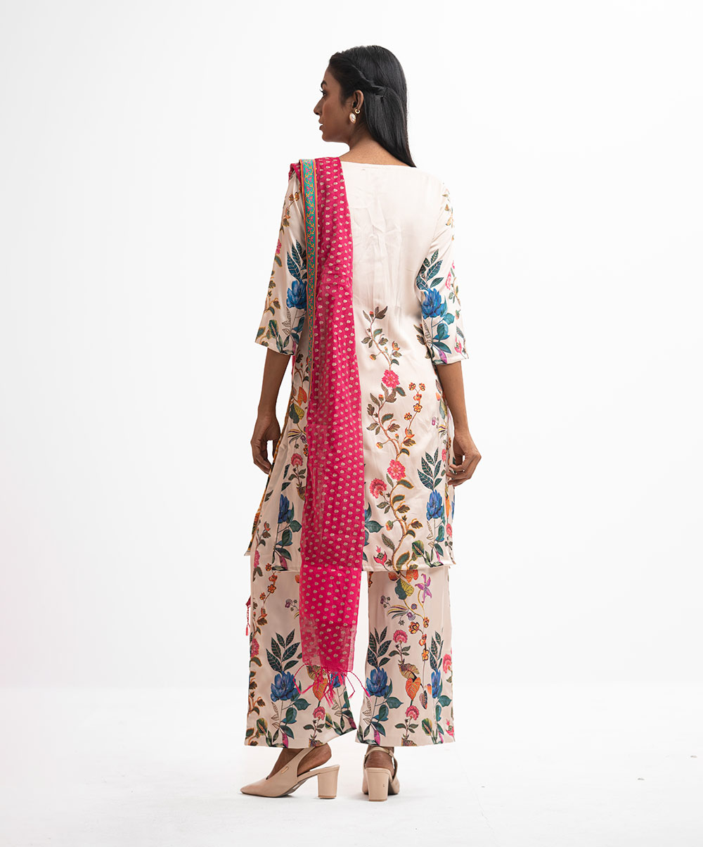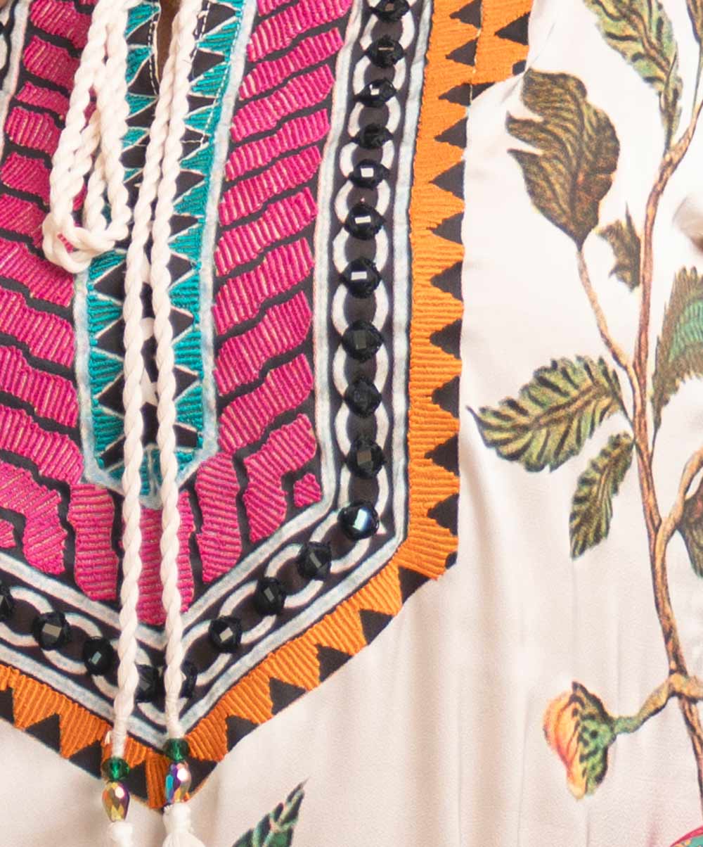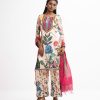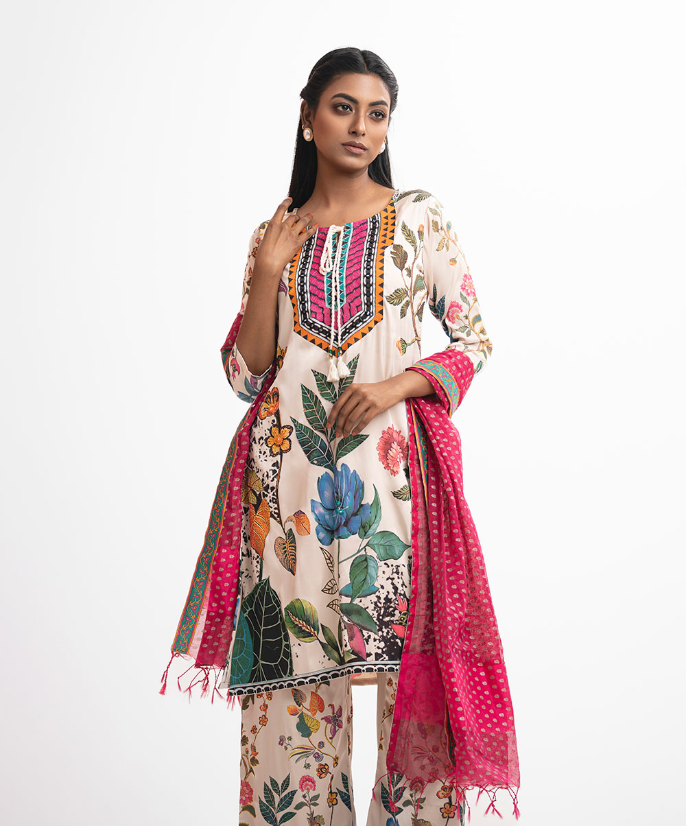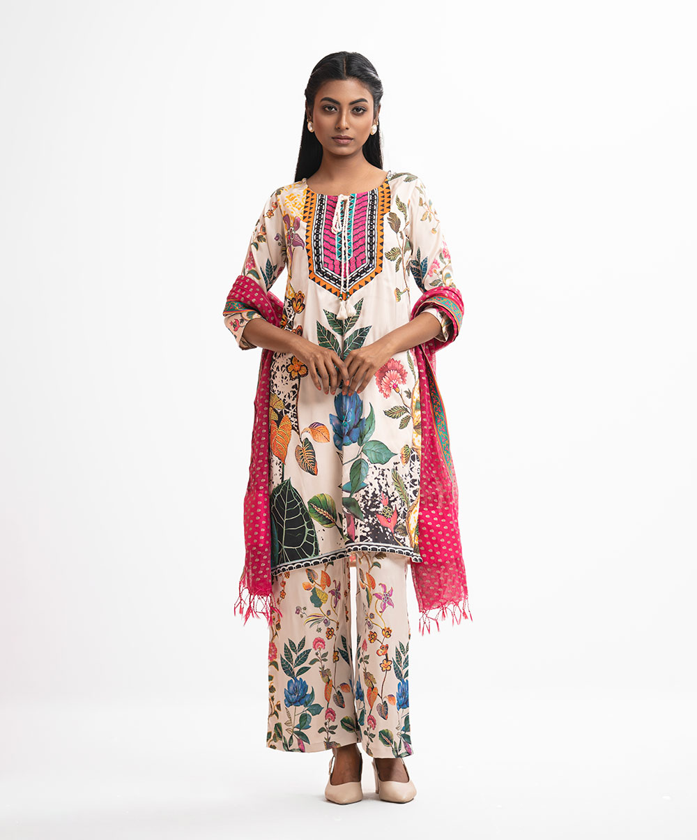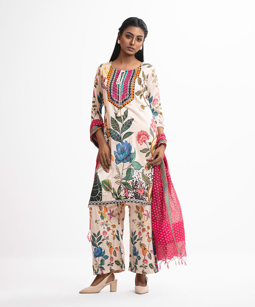 Women’s printed salwar kameez in georgette fabric. Round neck with tassel tie, three-quarter sleeves and embroidery at the front of kameez. Half-silk dupatta with palazzo pants.