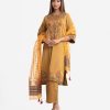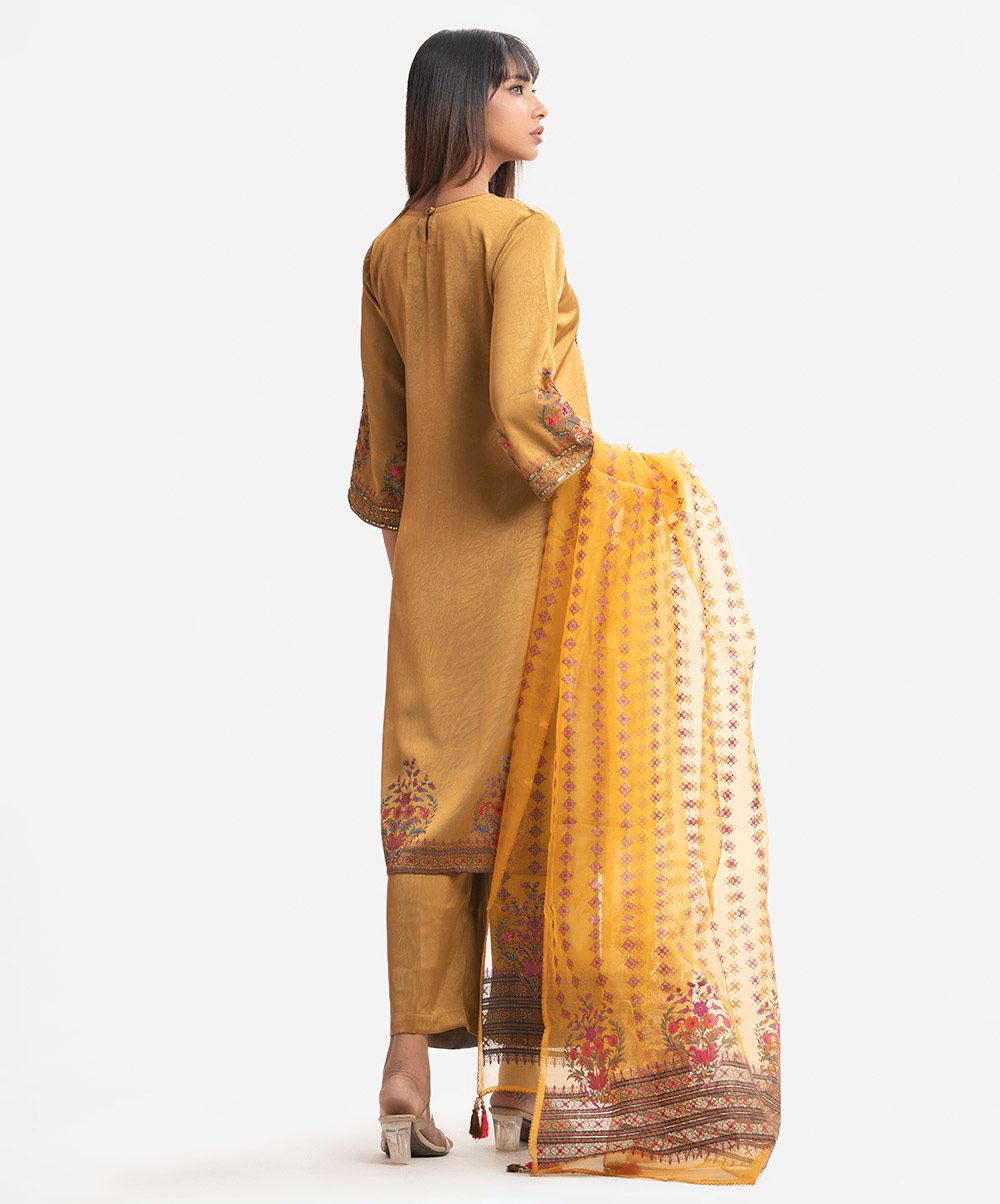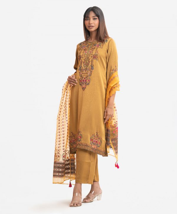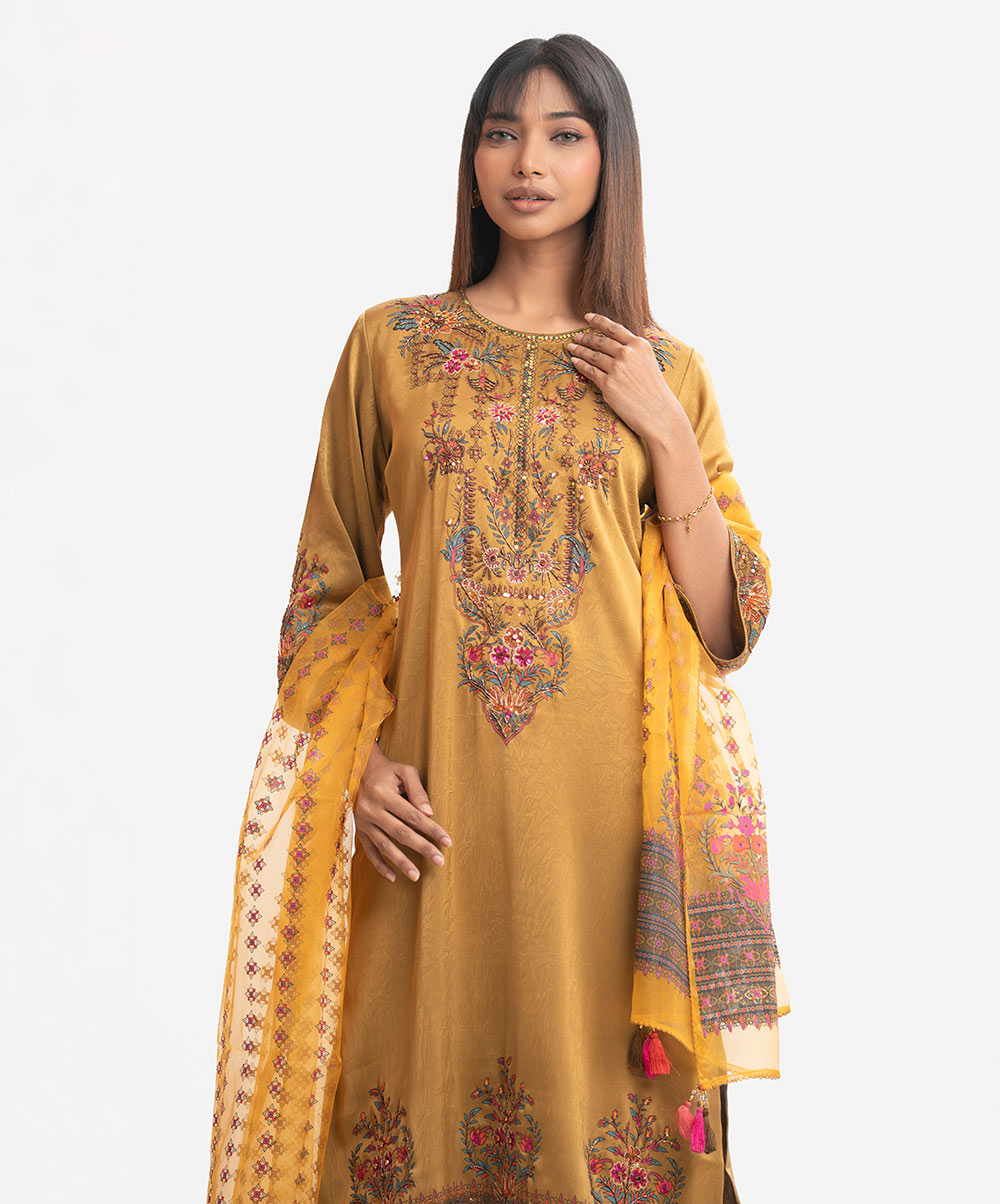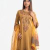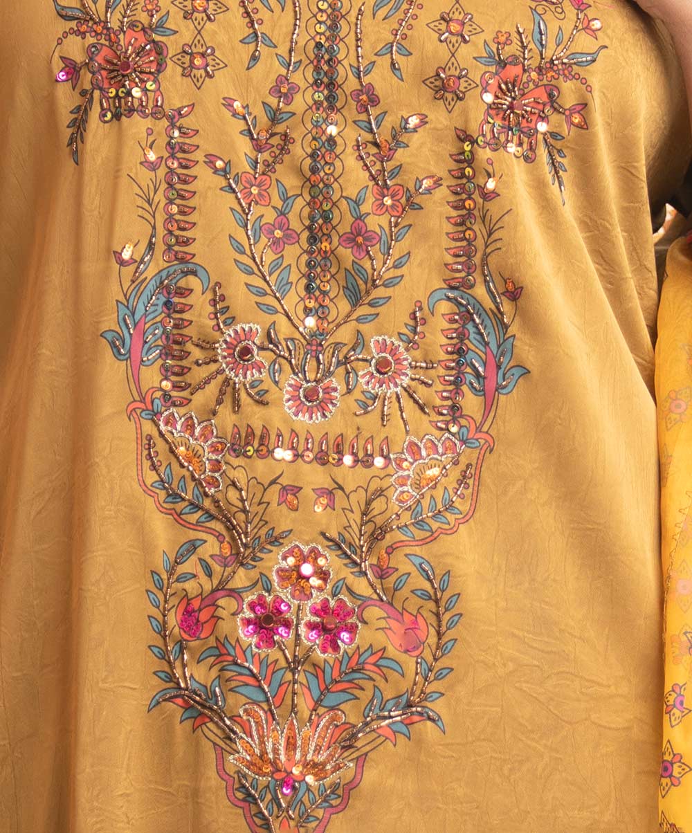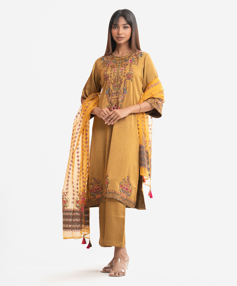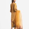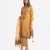 Women’s exclusive salwar kameez in Nargisus by Le Reve. Round neck, three-quarter bell sleeves and heavy karchupi at the front of kameez in tencel fabric. Muslin dupatta with tassels and palazzo pants.