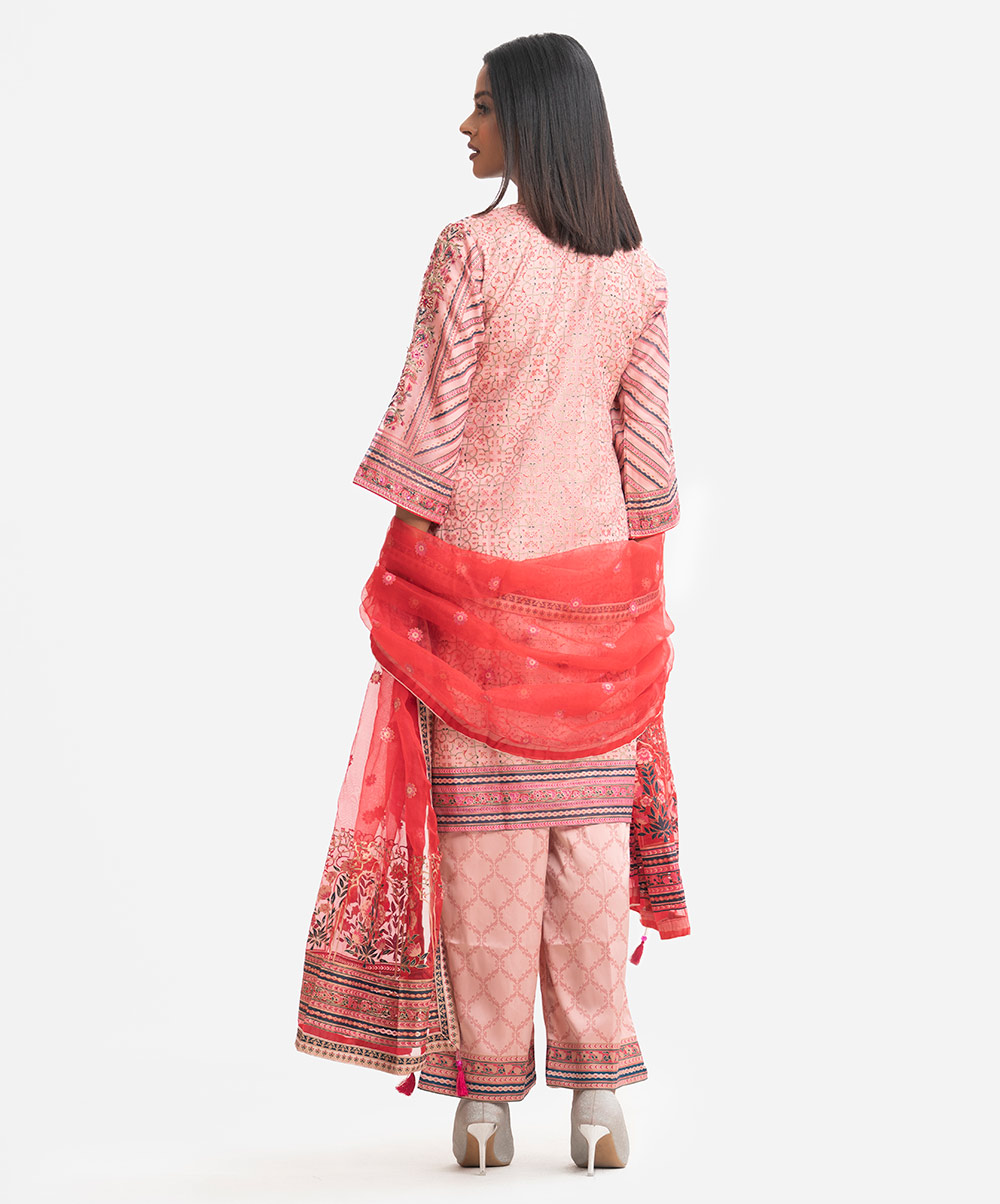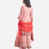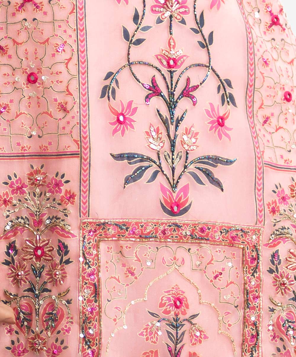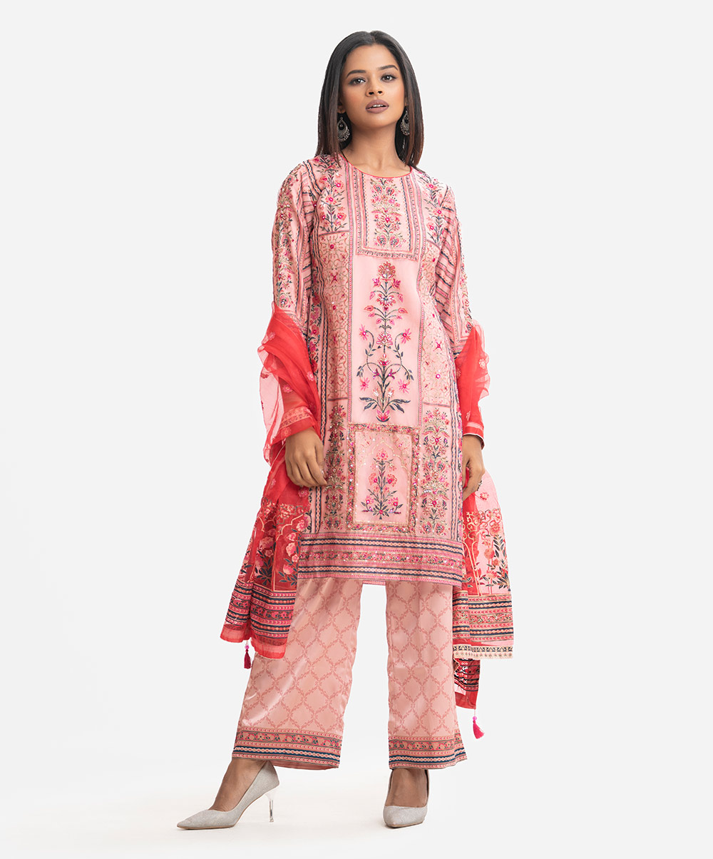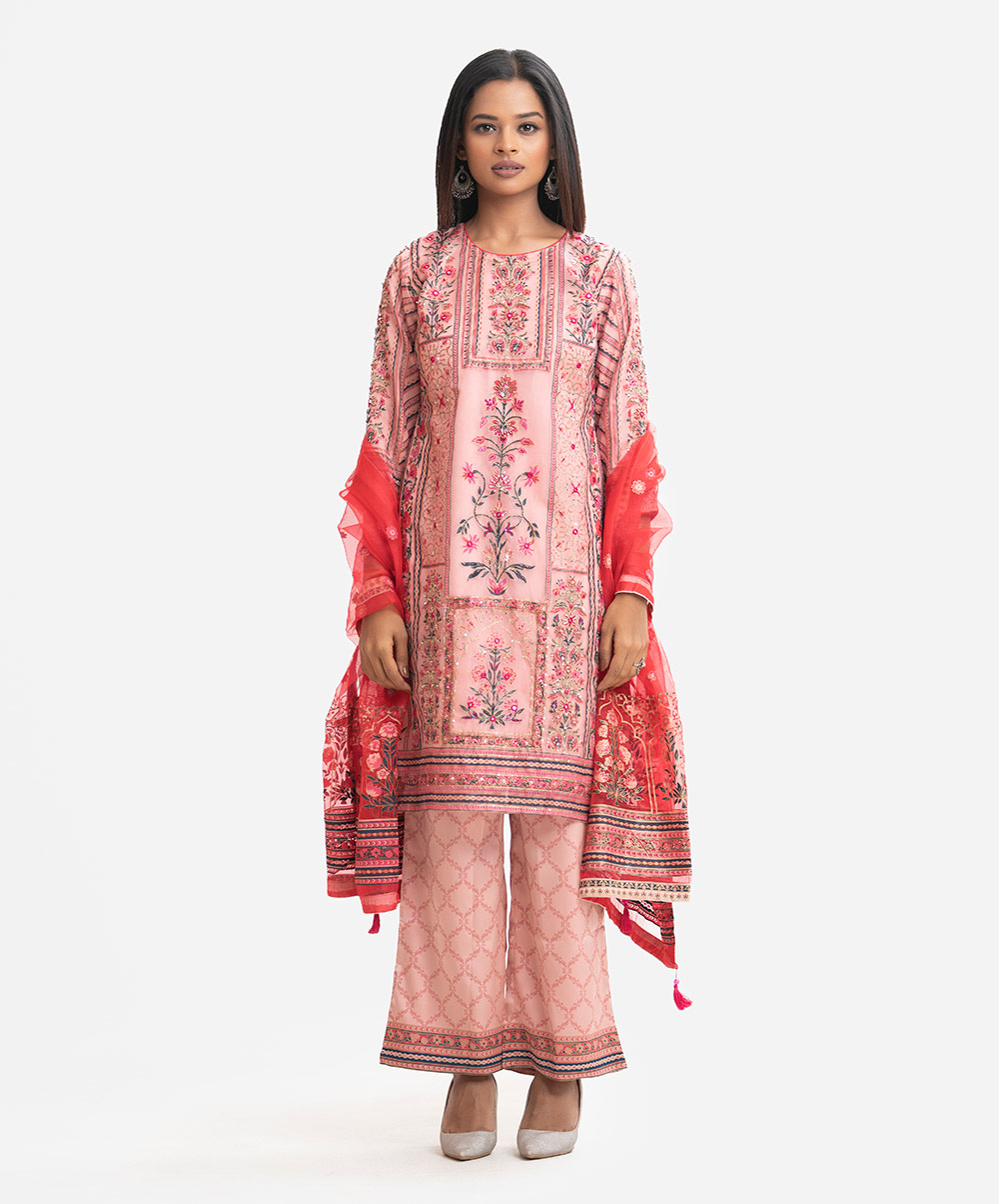 Women’s exclusive salwar kameez in Nargisus by Le Reve. Muslin fabric front part kameez with georgette lining. Round neck, three-quarter sleeves and heavy karchupi detail kameez. With a muslin dupatta & palazzo pants.