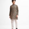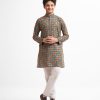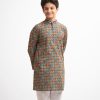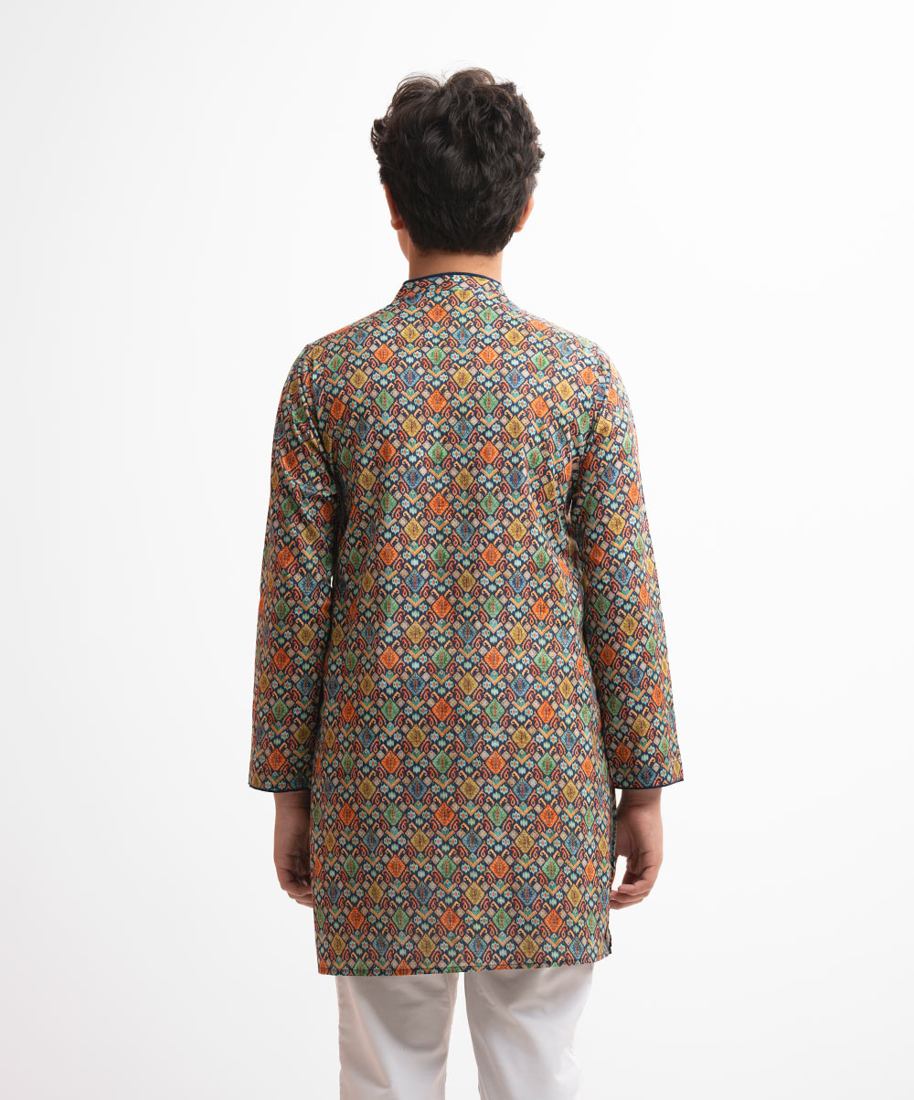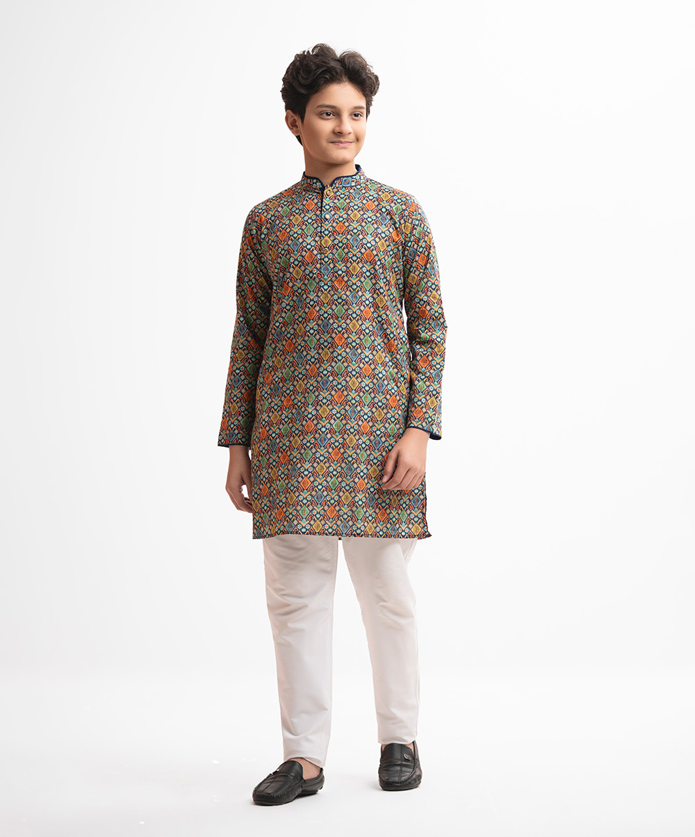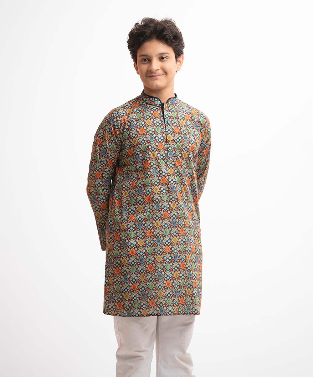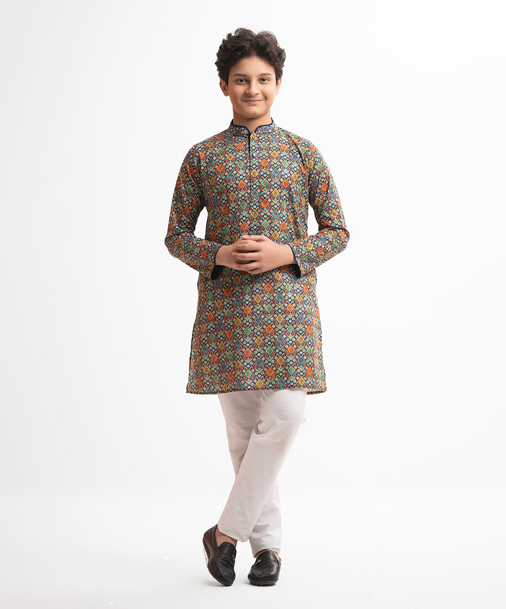 Teen boys ethnic printed panjabi in cotton fabric. Mandarin collar, full sleeves and inseam pockets.
