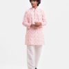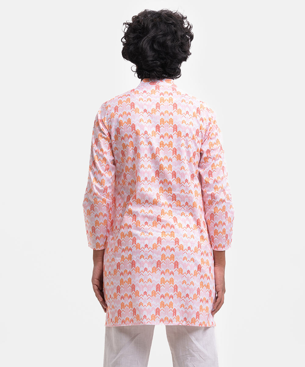 Teen boy’s panjabi in printed cotton fabric. Mandarin collar with metal buttons on the placket & full sleeves. Inseam pockets.