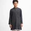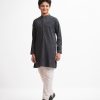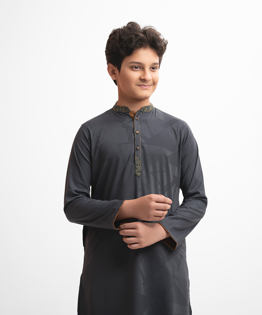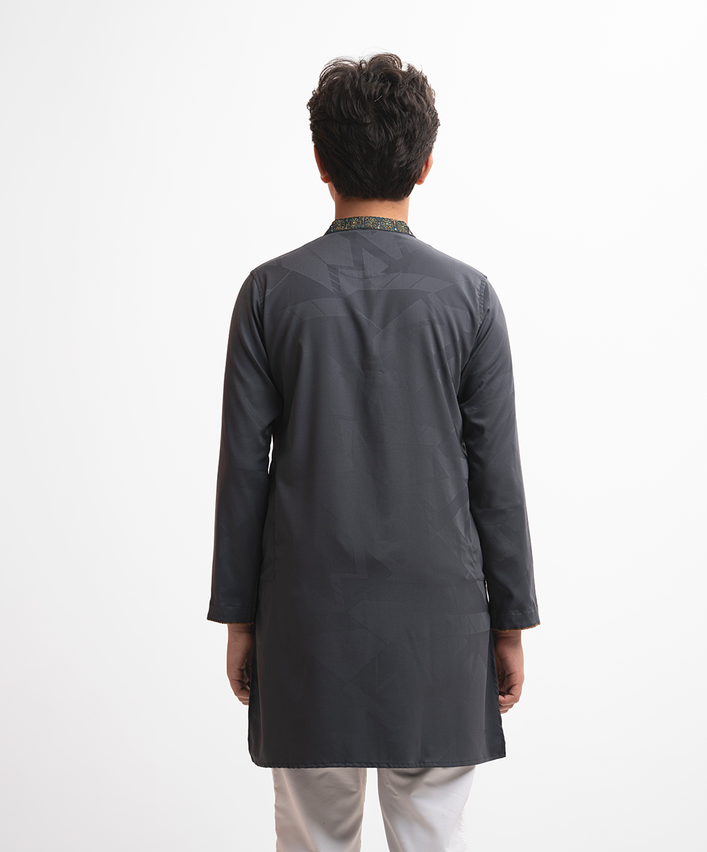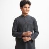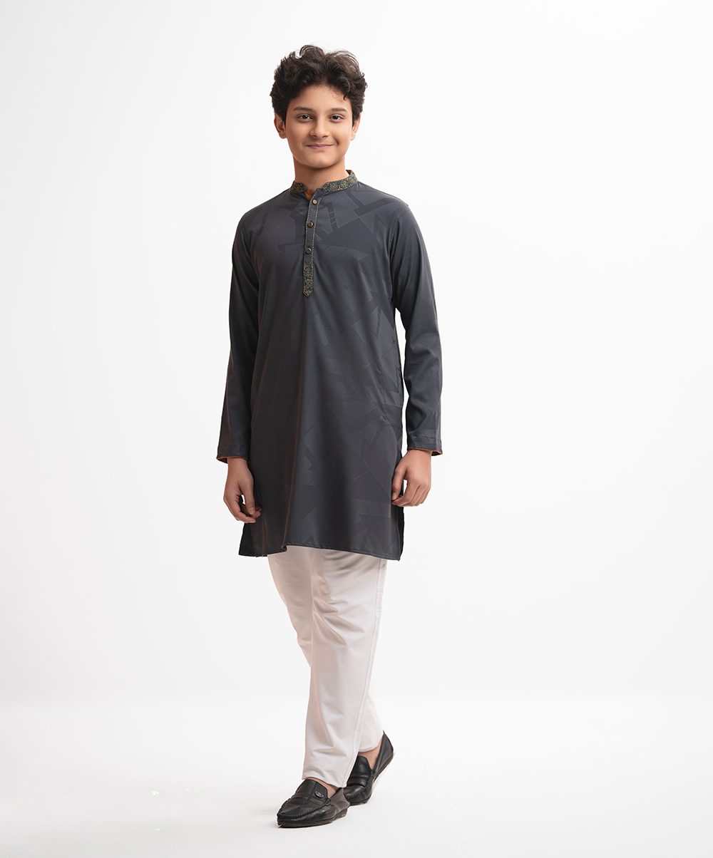 Teen boy’s panjabi in cotton jacquard fabric. Mandarin collar & full sleeves. Embroidery at front & inseam pockets.