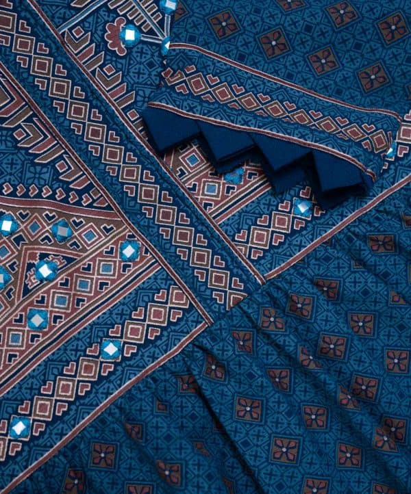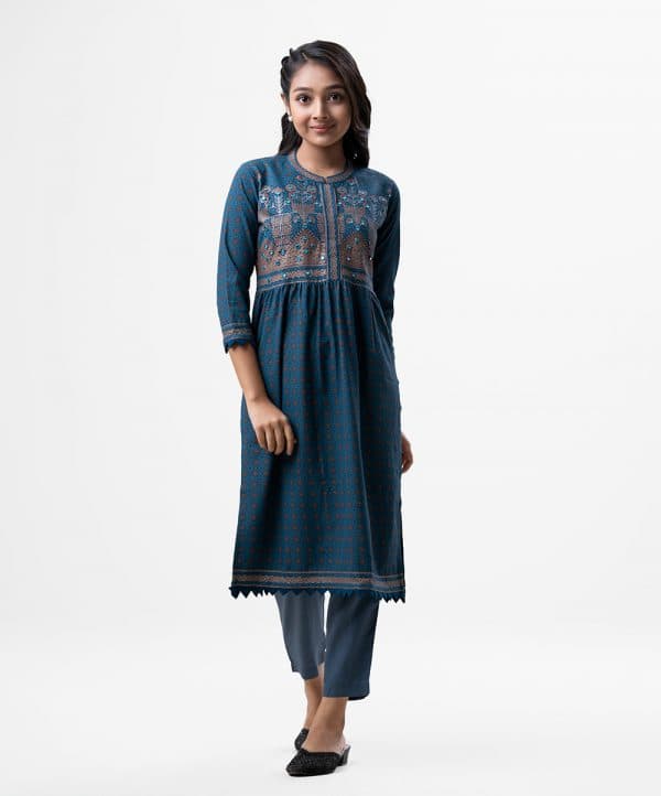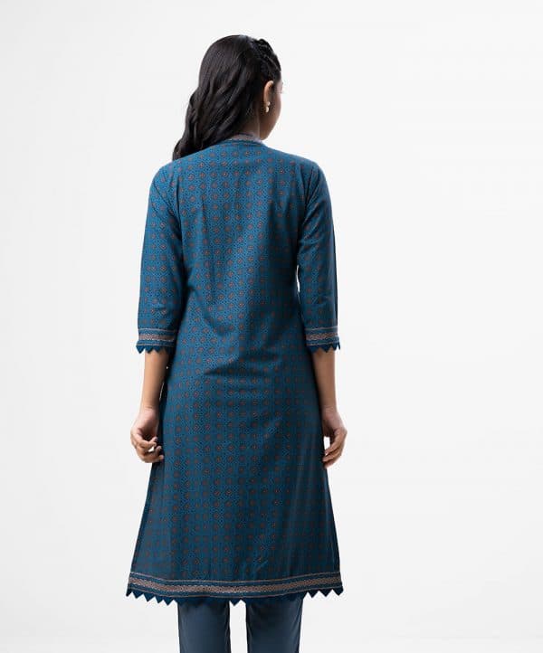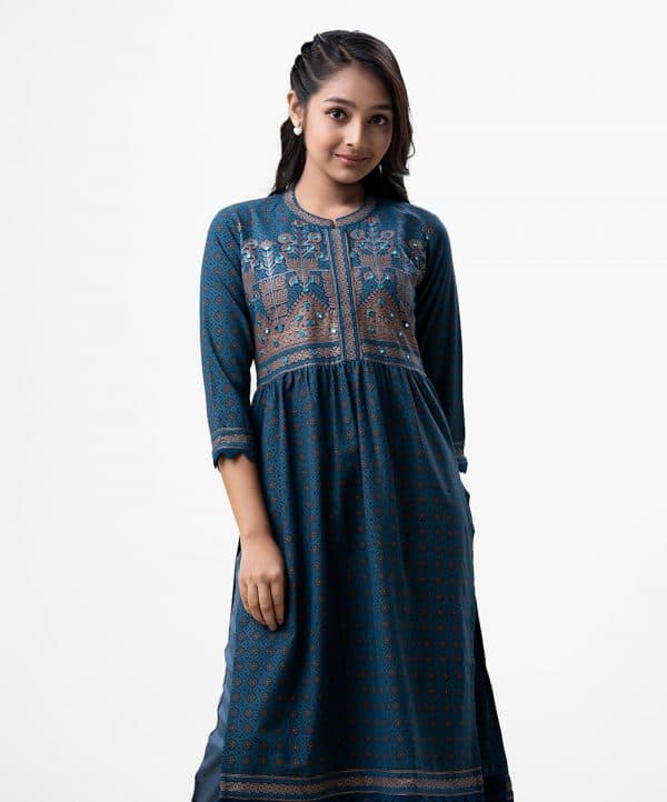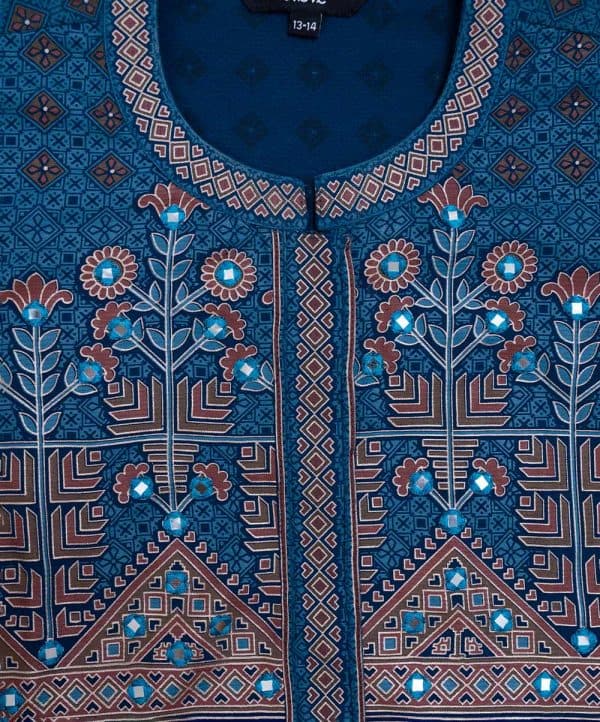 Printed straight kameez in georgette fabric. Mandarin collar, three-quarter sleeves. Embroidery at the front.