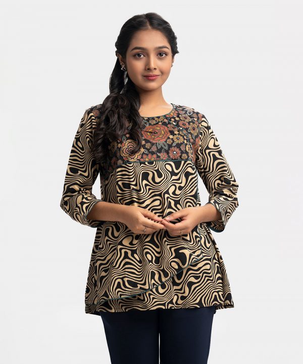 Teen girls A-line tunic in printed georgette fabric. Round neck, three-quarter sleeves. Wrap design with buttons, karchupi at front.