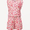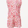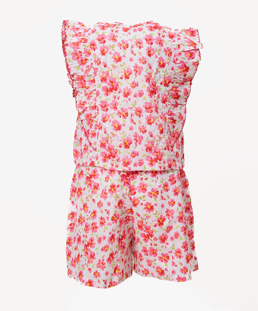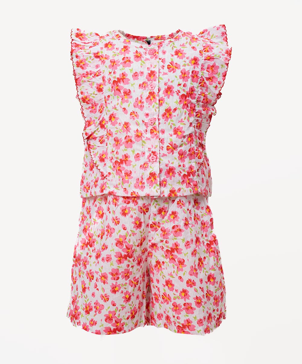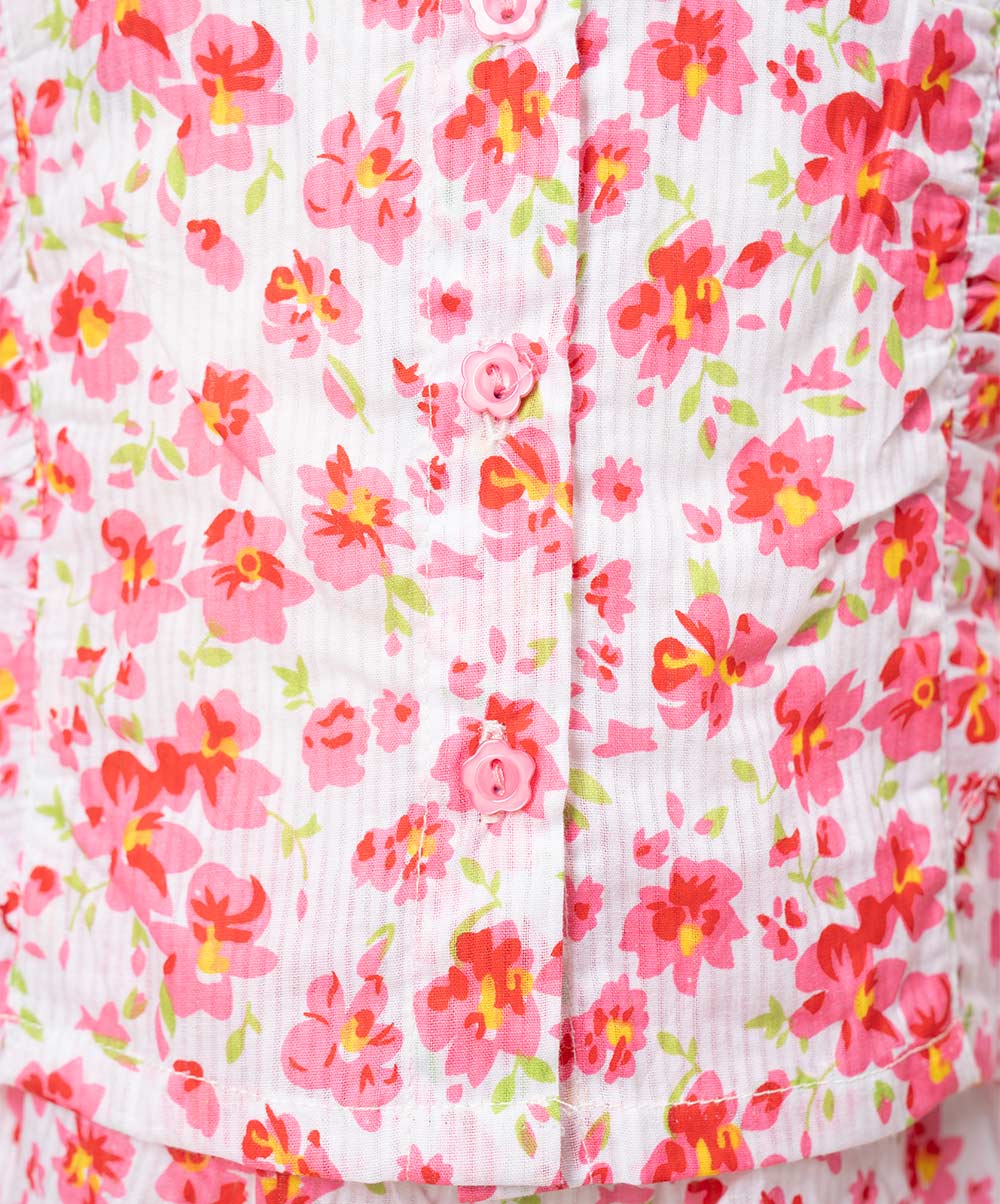 Newborn baby girl’s floral printed bottom tops set in cotton fabric. Round neck with buttons placket, sleeveless, ruffle at the front of the top with short pants.